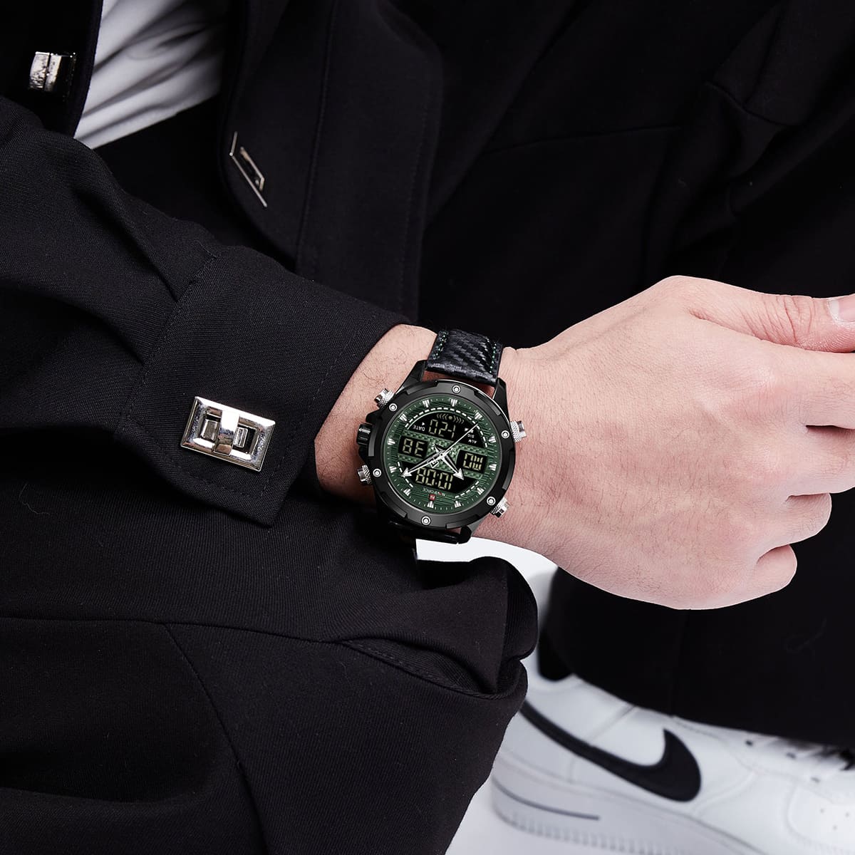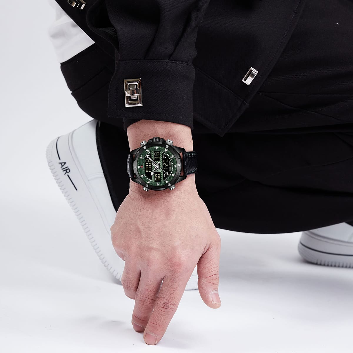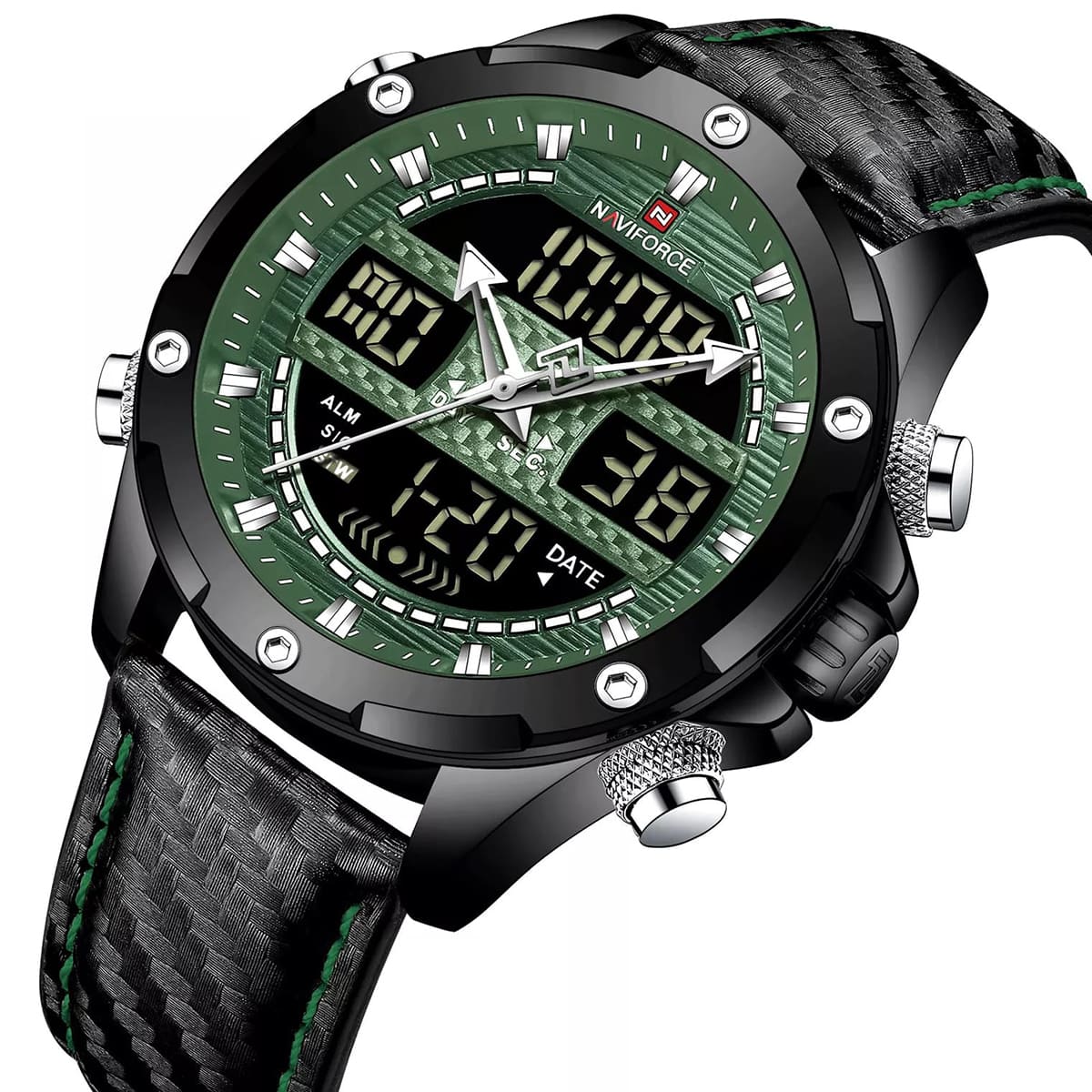 ساعة يد نافي فورس Naviforce NF9194 B GN B رجالي أصلية موديل ( NF9194 ) نظرية و رقمية بلون مينا اخضر و استيك جلد بلون اسود احصل عليها غدا خلال 24 ساعة داخل القاهرة و الجيزة و الاسكندرية