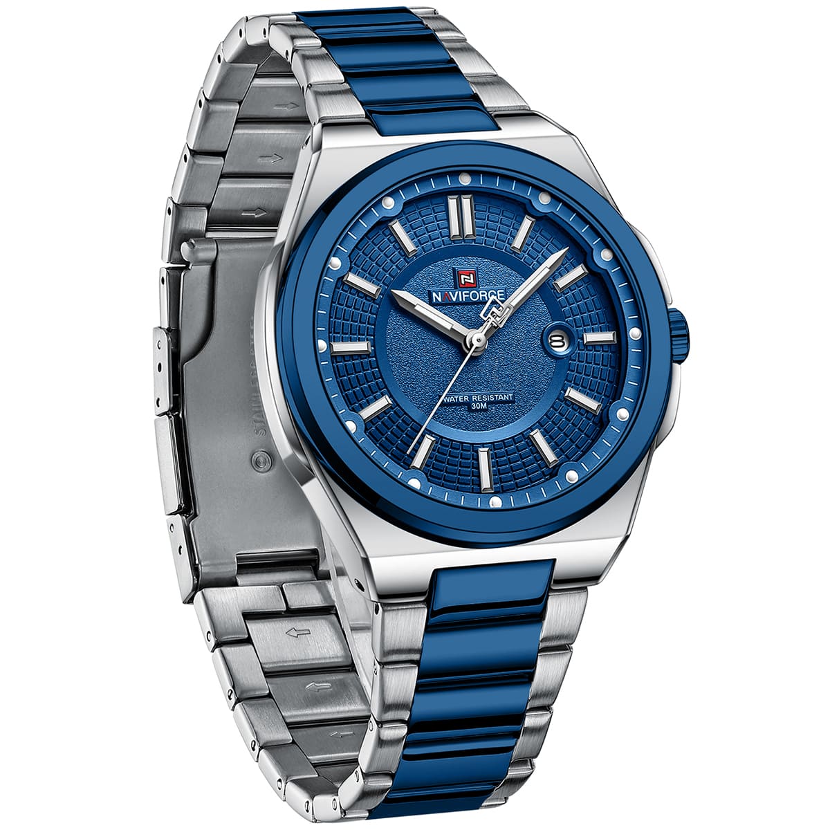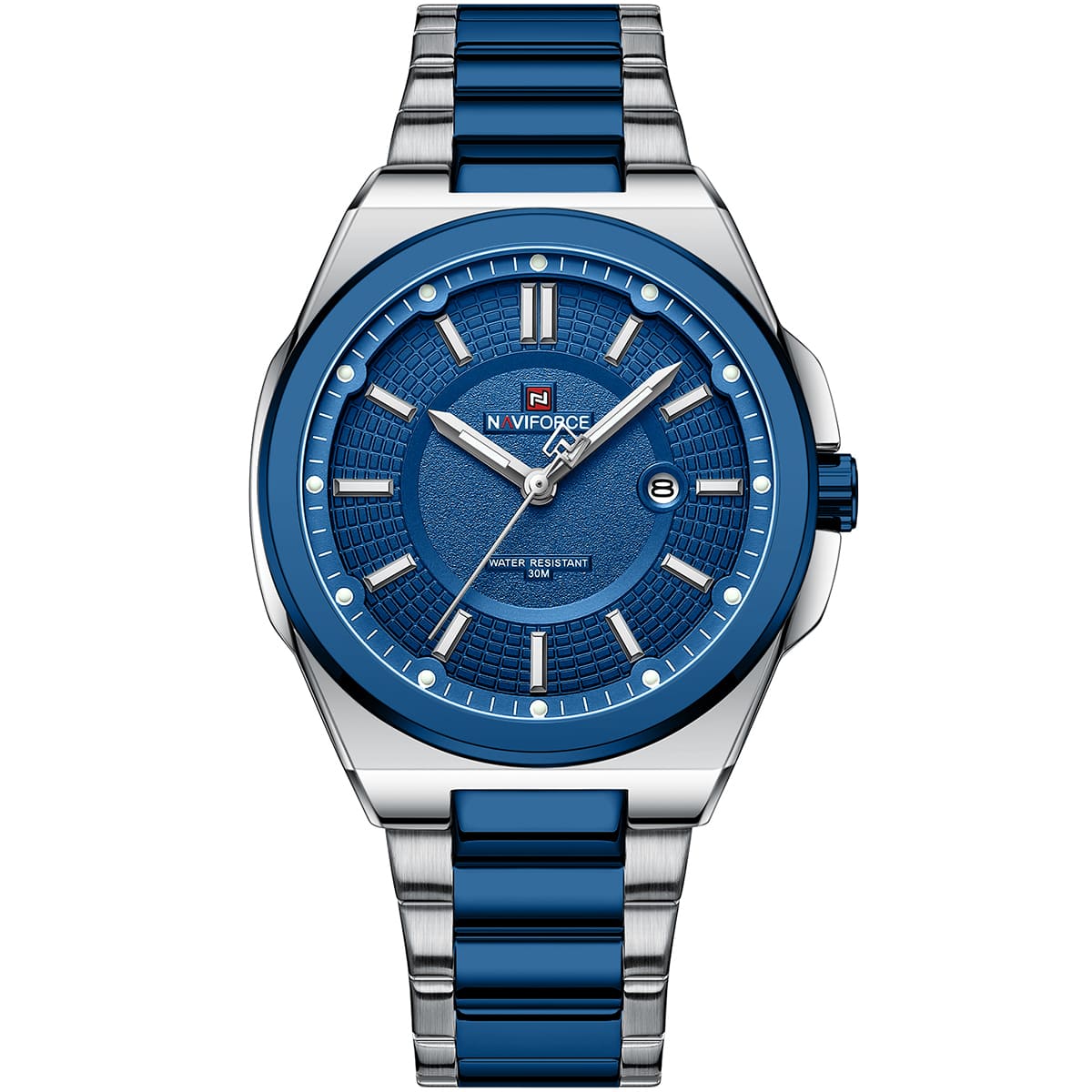 ساعة يد نافي فورس Naviforce NF 9212 S BE رجالي أصلية موديل ( NF9212 ) نظرية Water Resistant-30M بلون ازرق و استيك ستانلس ستيل بلون فضي و ازرق  احصل عليها الآن من المرشدى للساعات – Elmorshedy Watches