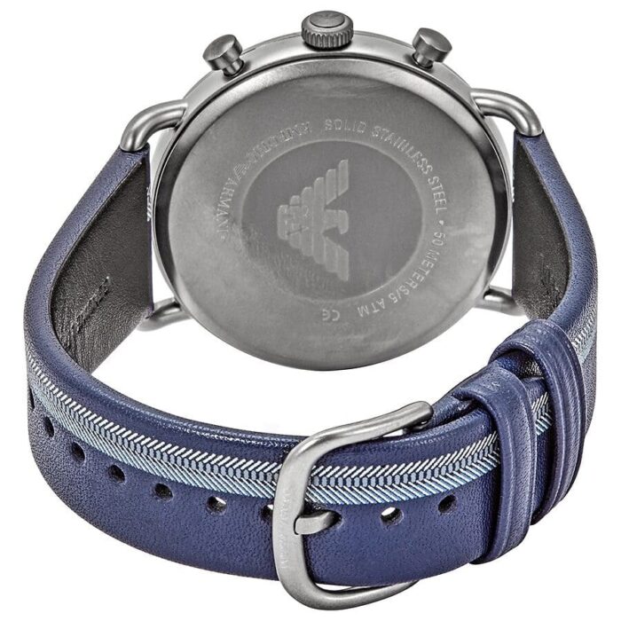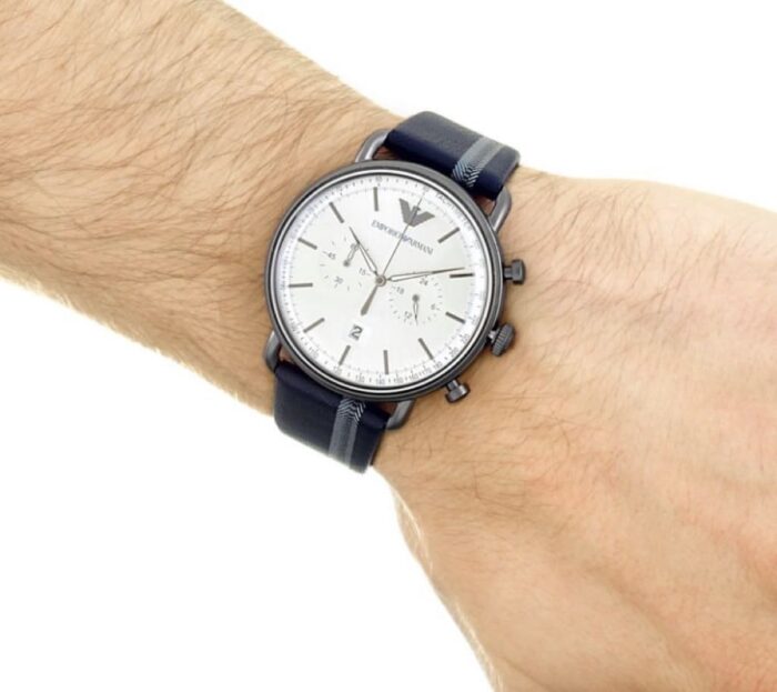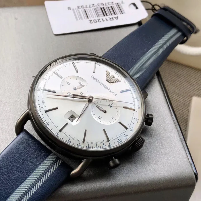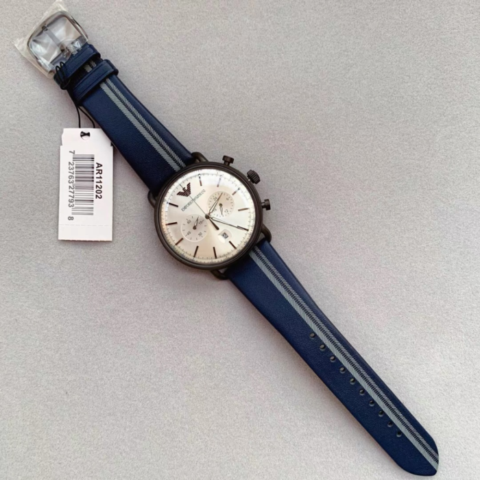 ساعة امبوريو ارماني للرجال اصلية موديل Aviator AR11202 لون فضي واستيك جلد طبيعي لون ازرق.