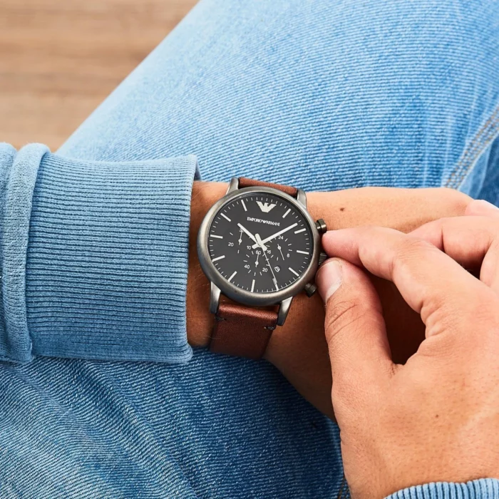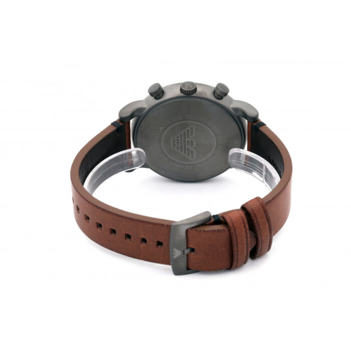 ساعة امبوريو ارماني للرجال اصلية موديل  AR1919 بلون اسود واوستيك جلد طبيعي بلون بني.