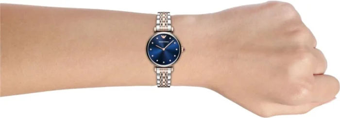 ساعة امبوريو ارماني للنساء اصلية موديل Gianni T-Bar AR11092 لون ازرق و استيك معدن ستانلس لون فضي * روز جولد.