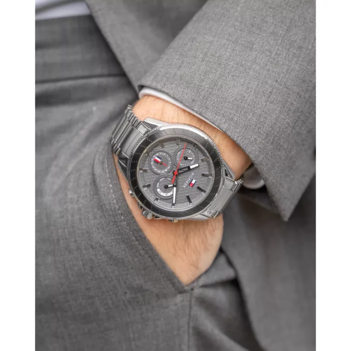 ساعة تومي هيلفيغر Tommy Hilfiger للرجال أصلية موديل 1791857 Aiden بـ لون رمادي و اوستيك معدن بـ لون فضي.