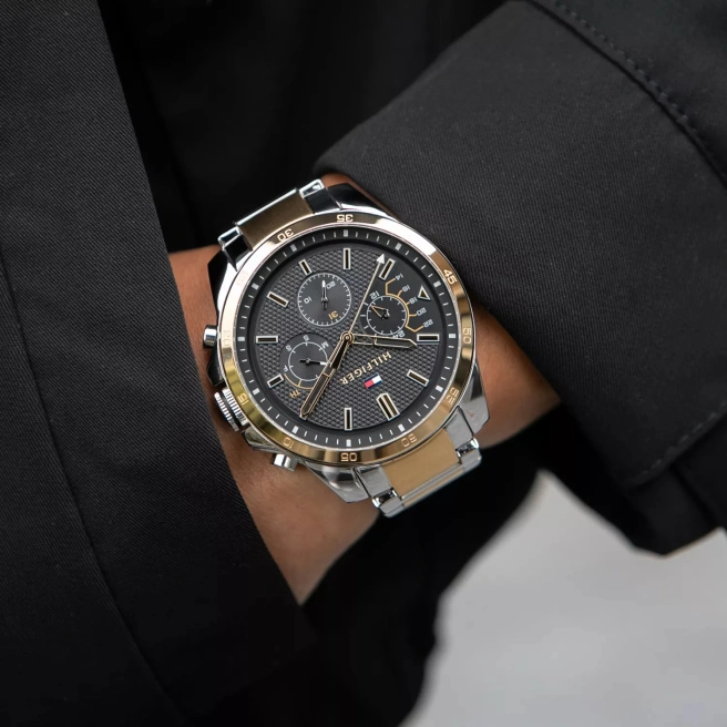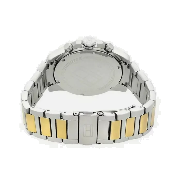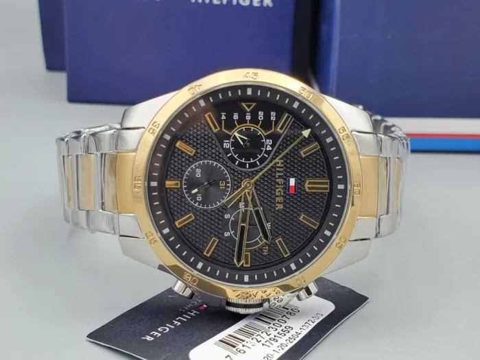 ساعة تومي هيلفيغر للرجال اصلية موديل Decker 1791559 لون اسود واستيك معدن ستانلس لون فضي * ذهبي.