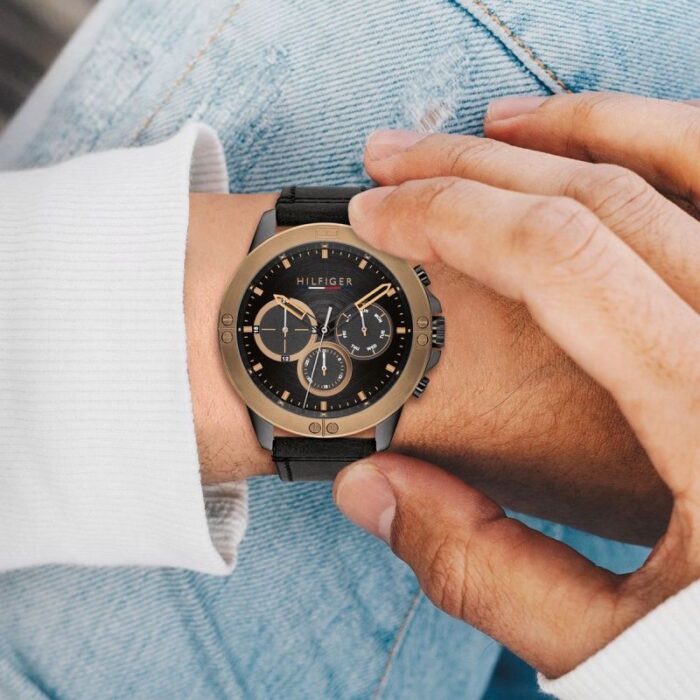 ساعة تومي هيلفيغر للرجال أصلية موديل (هاري) Harley 1791893 لون اسود و استيك جلد طبيعي لون اسود.