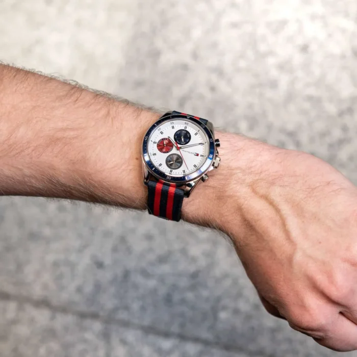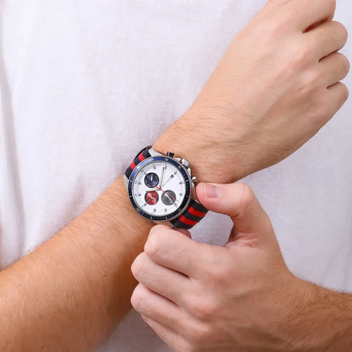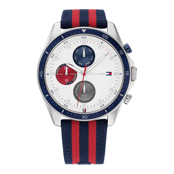ساعة تومي هيلفيغر اصليه  للرجال موديل 1792035 بلون ابيض واوستك قماش بلون احمر.