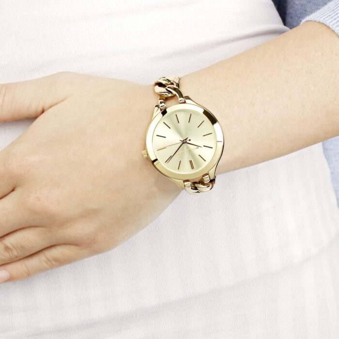 ساعة مايكل كورس حريمي أصلية موديل (رانواي) Runway MK3222 بلون ذهبي و استيك معدن بلون ذهبي.