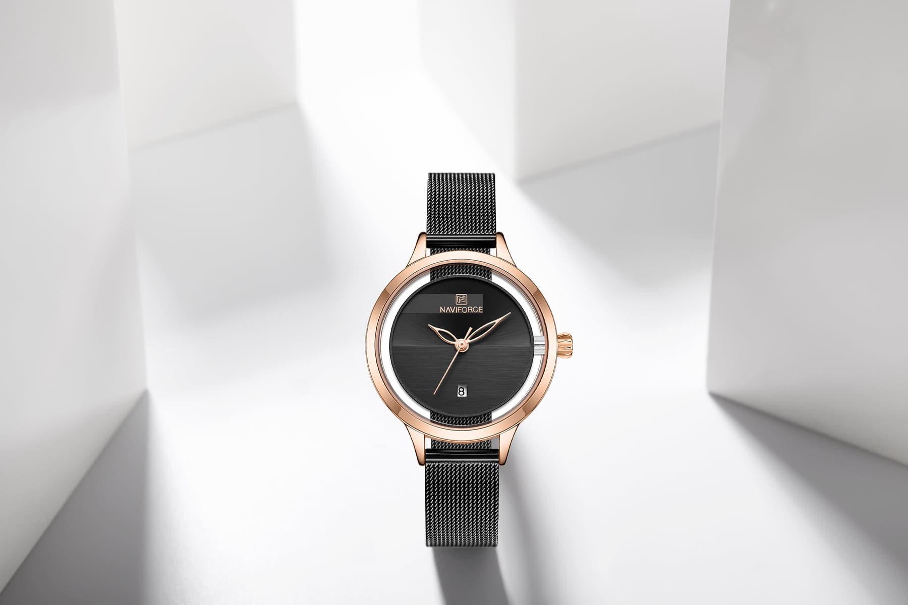 ساعة يد نافي فورس Naviforce NF5014 RG B حريمي أصلية موديل ( NF5014 ) نظرية بلون مينا اسود و استيك معدن بلون اسود احصل عليها غدا خلال 24 ساعة داخل القاهرة و الجيزة و الاسكندرية