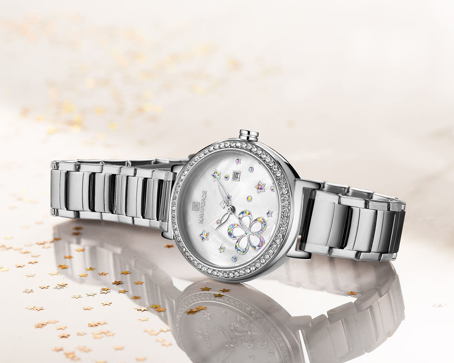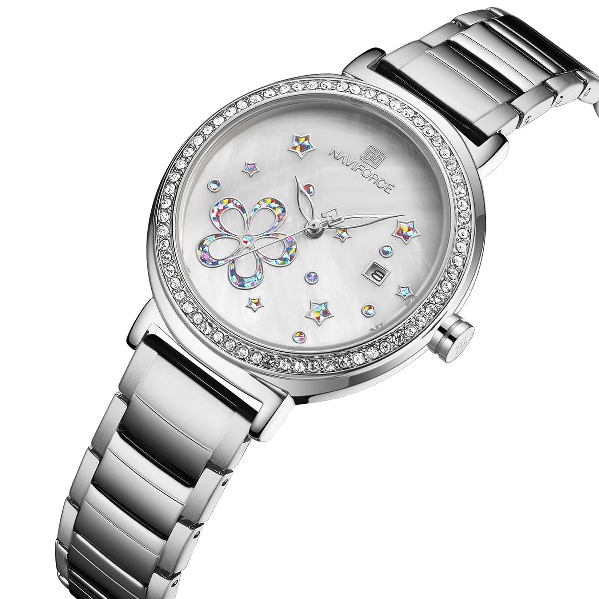 ساعة يد نافي فورس Naviforce NF5016 S W حريمي أصلية موديل ( NF5016 ) نظرية بلون مينا ابيض و استيك معدن بلون فضي احصل عليها غدا خلال 24 ساعة داخل القاهرة و الجيزة و الاسكندرية