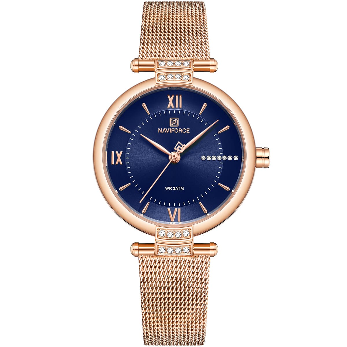 ساعة يد نافي فورس Naviforce NF5019 RG BE حريمي أصلية موديل ( NF5019 ) نظرية بلون مينا ازرق و استيك معدن بلون نحاسي احصل عليها غدا خلال 24 ساعة داخل القاهرة و الجيزة و الاسكندرية