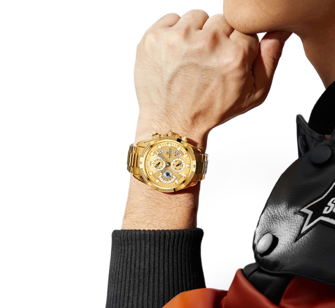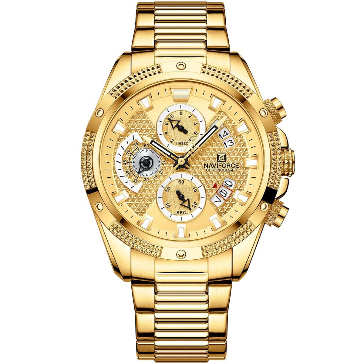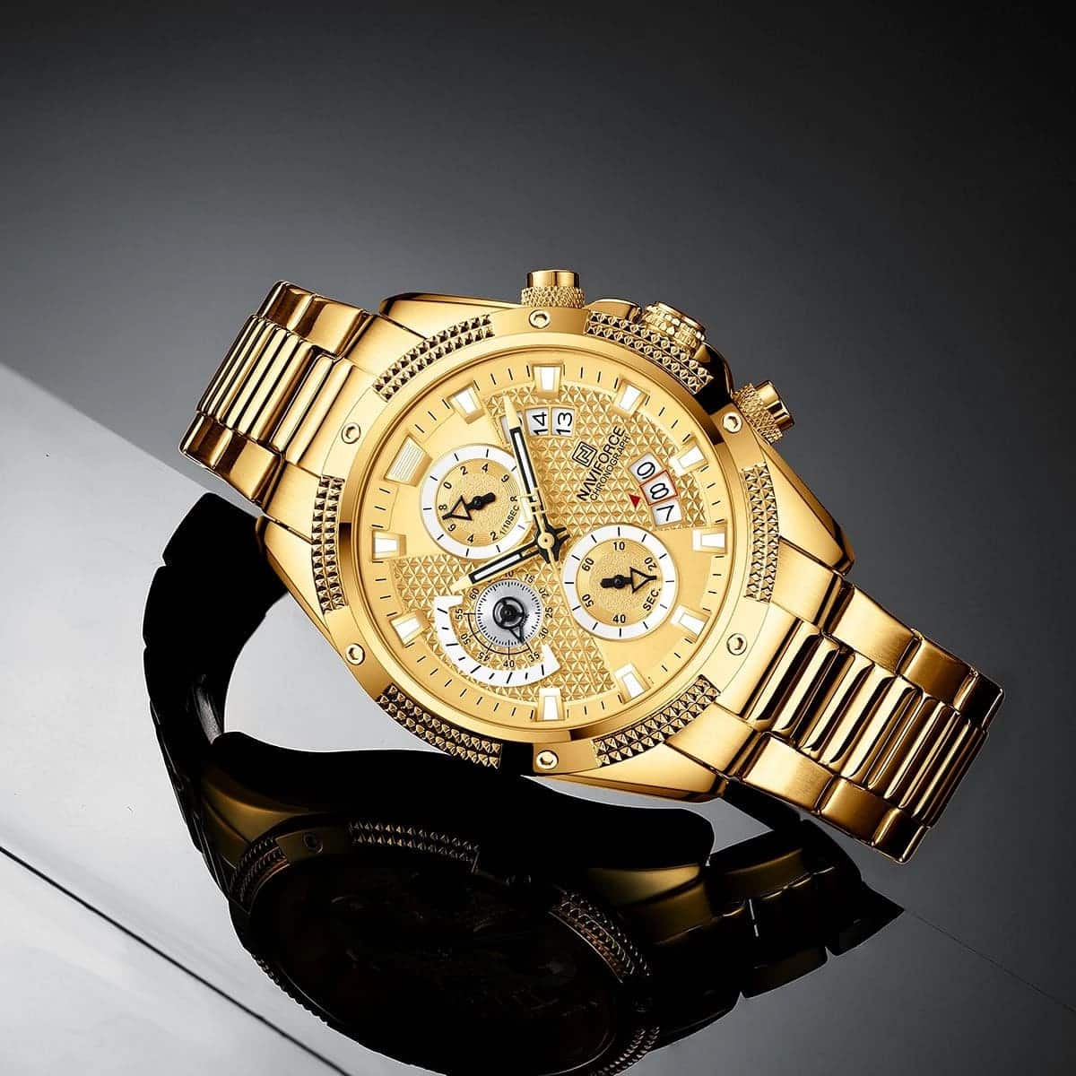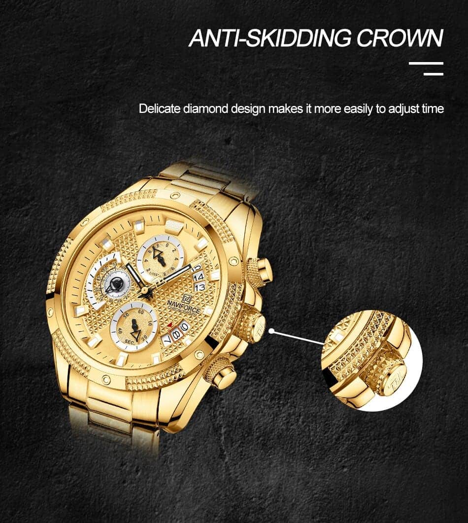 ساعة يد نافي فورس Naviforce NF8021 G G رجالي أصلية موديل ( NF8021 ) نظرية بلون مينا ذهبي و استيك معدن بلون ذهبي احصل عليها غدا خلال 24 ساعة داخل القاهرة و الجيزة و الاسكندرية
