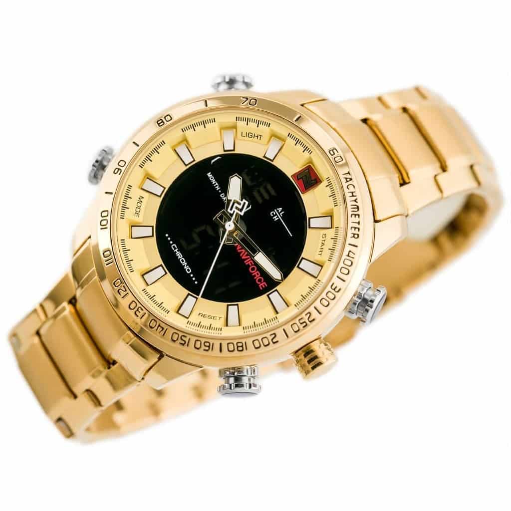 ساعة يد نافي فورس Naviforce NF9093 G G رجالي أصلية موديل ( NF9093 ) نظرية و رقمية بلون مينا اسود و ذهبي و استيك معدن بلون ذهبي احصل عليها غدا خلال 24 ساعة داخل القاهرة و الجيزة و الاسكندرية
