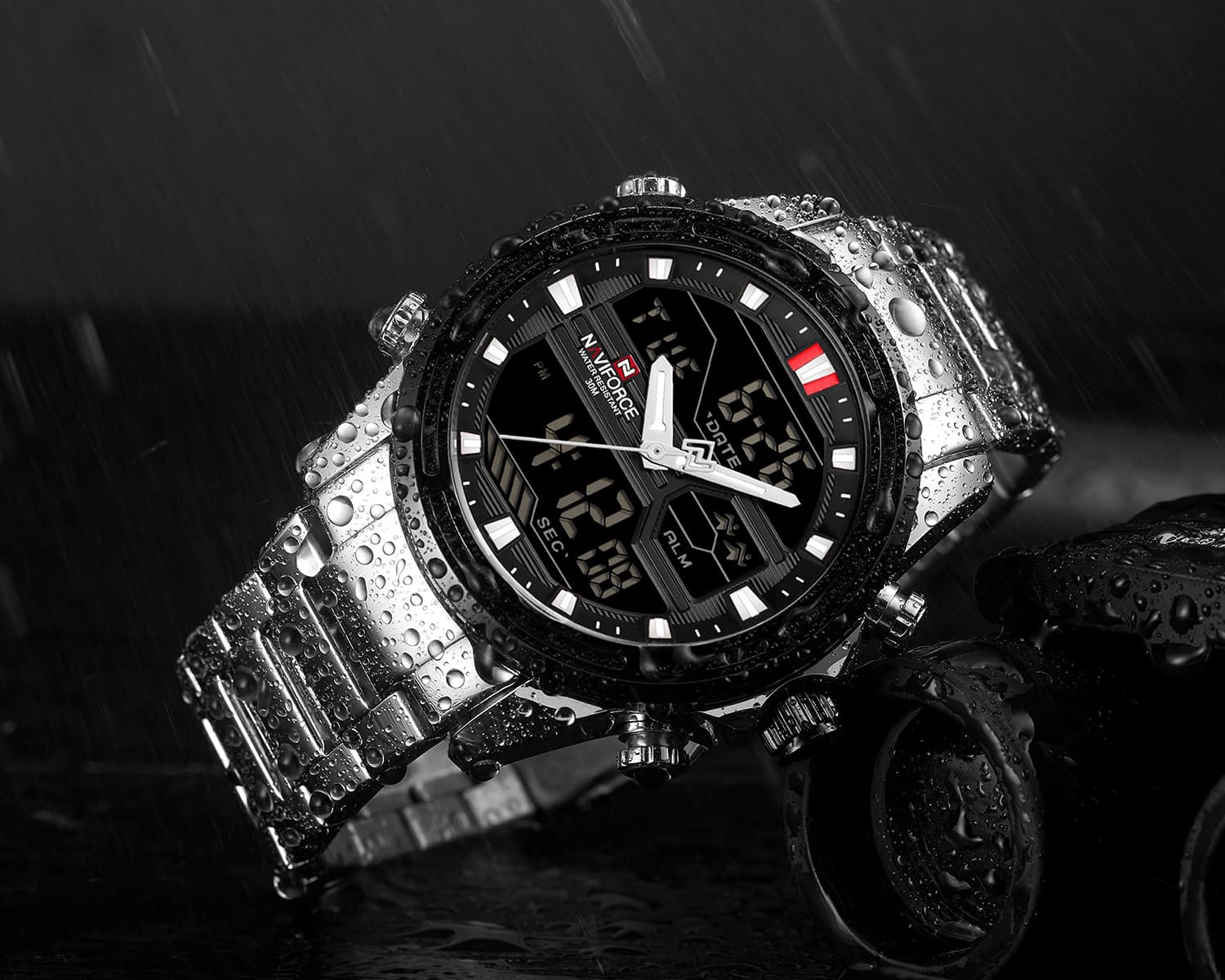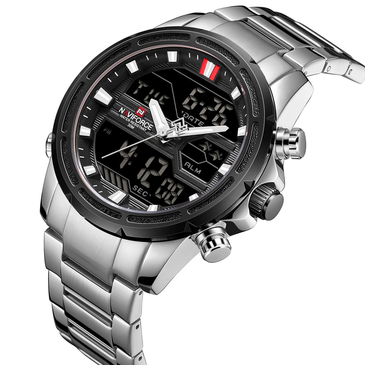 ساعة يد نافي فورس Naviforce NF9138S S B W رجالي أصلية موديل ( NF9138S ) نظرية و رقمية بلون مينا اسود و استيك معدن بلون فضي احصل عليها غدا خلال 24 ساعة داخل القاهرة و الجيزة و الاسكندرية
