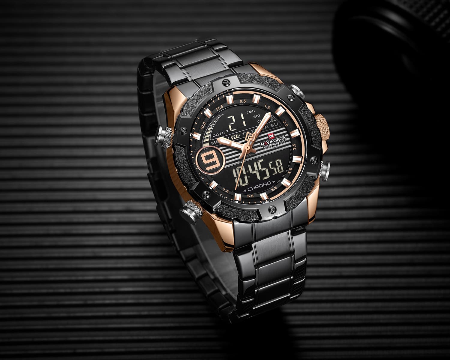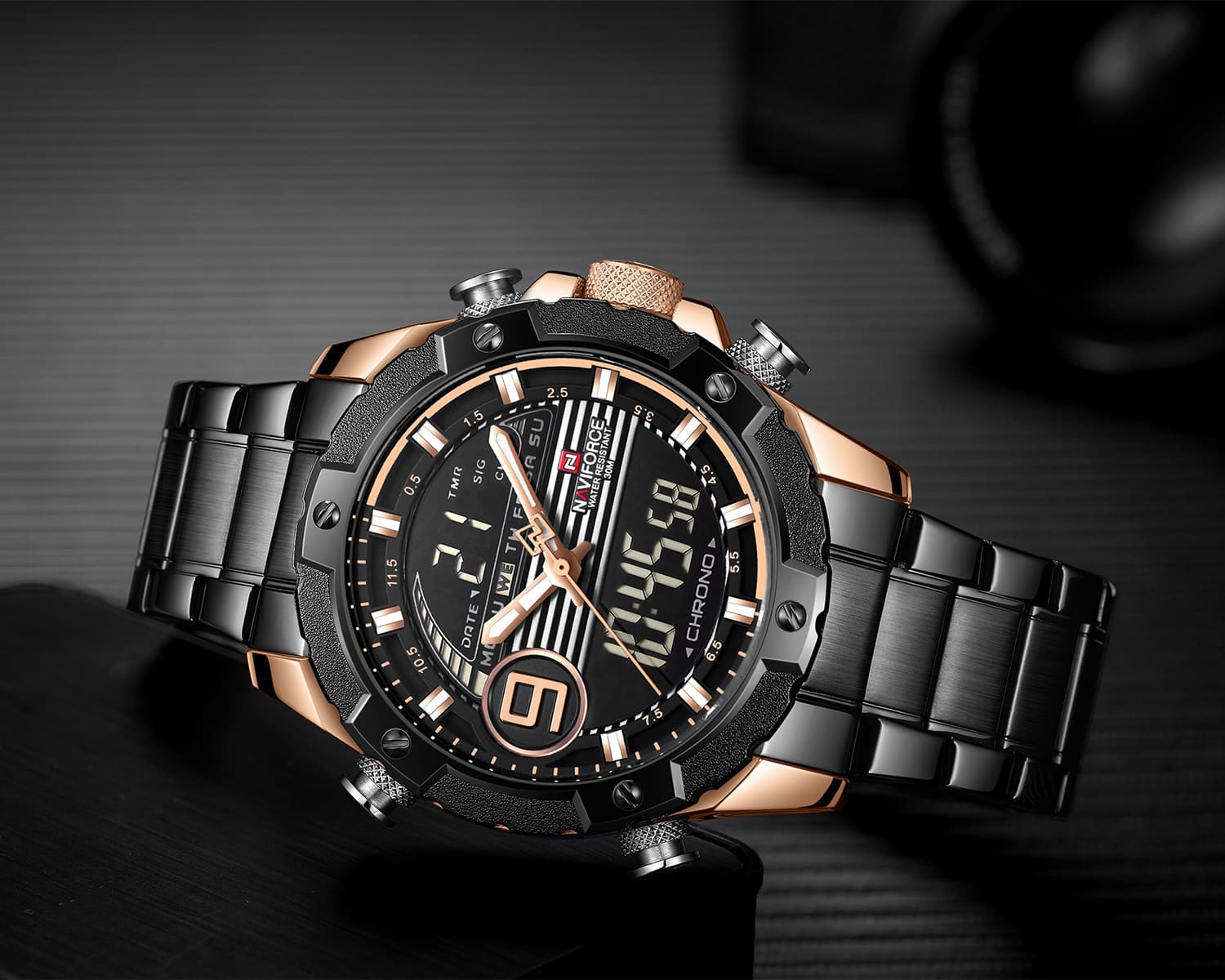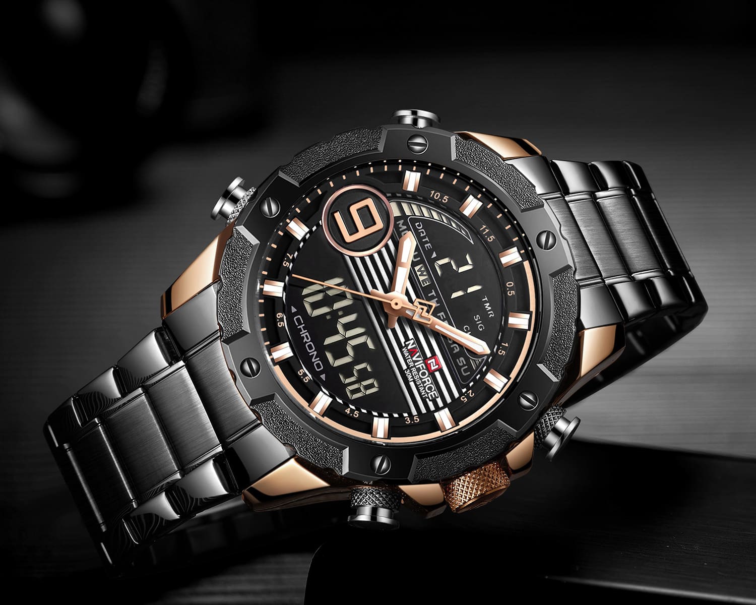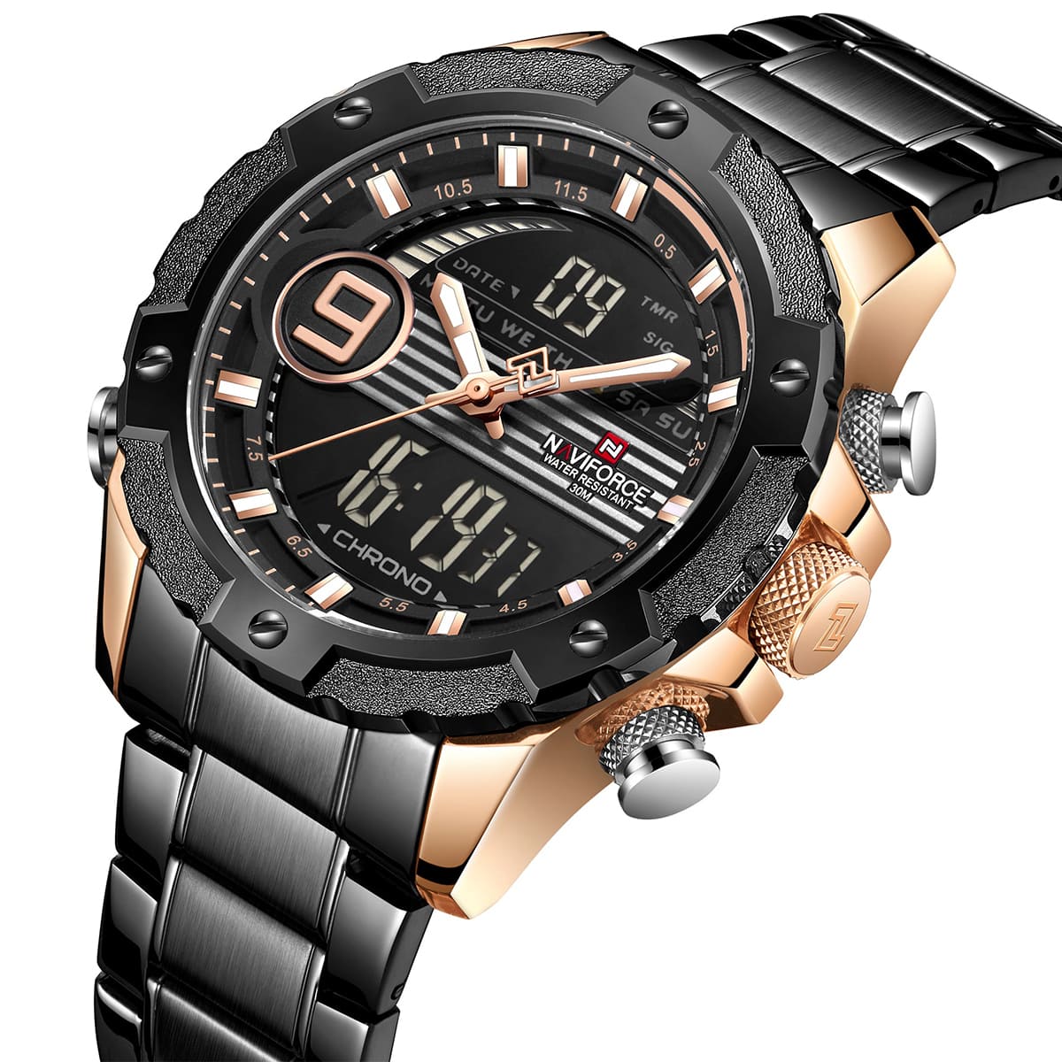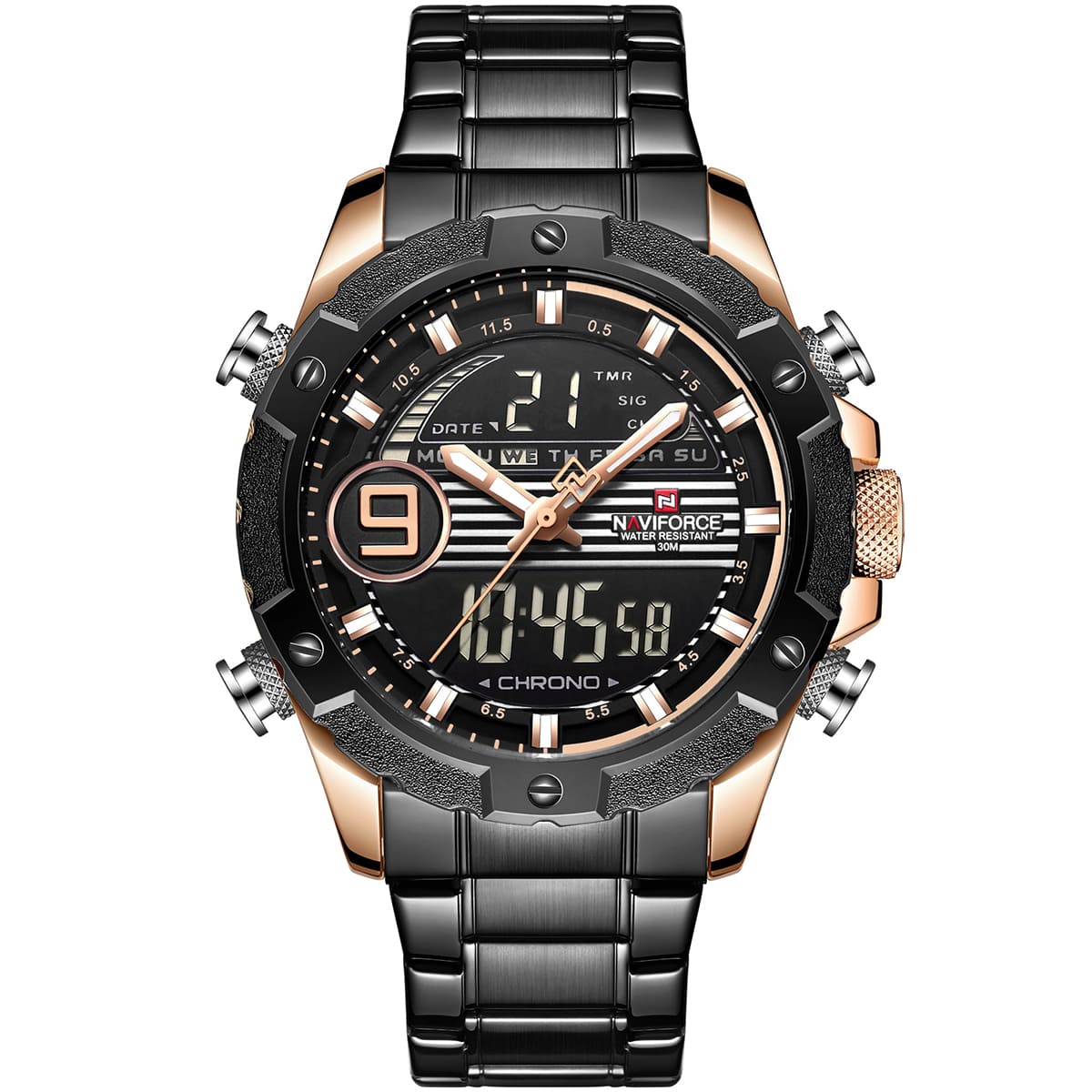 ساعة يد نافي فورس Naviforce NF9146S RG RG B رجالي أصلية موديل ( NF9146S ) نظرية و رقمية بلون مينا نحاسي و اسود و استيك معدن بلون اسود احصل عليها غدا خلال 24 ساعة داخل القاهرة و الجيزة و الاسكندرية