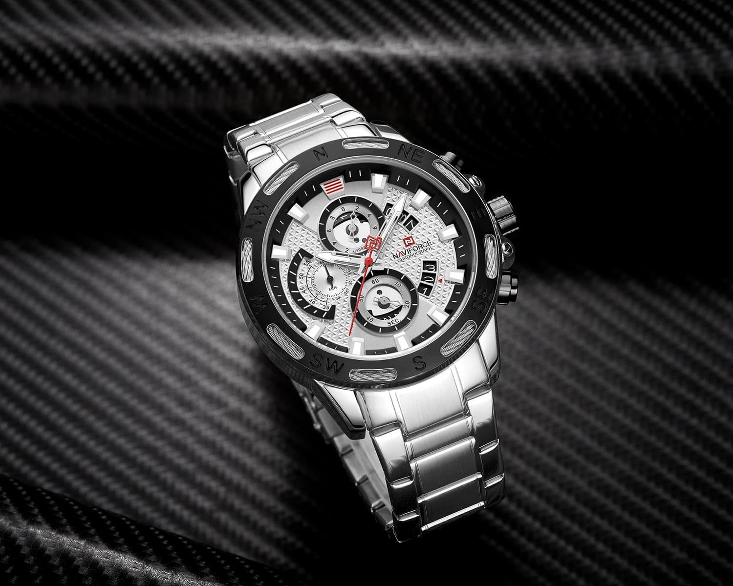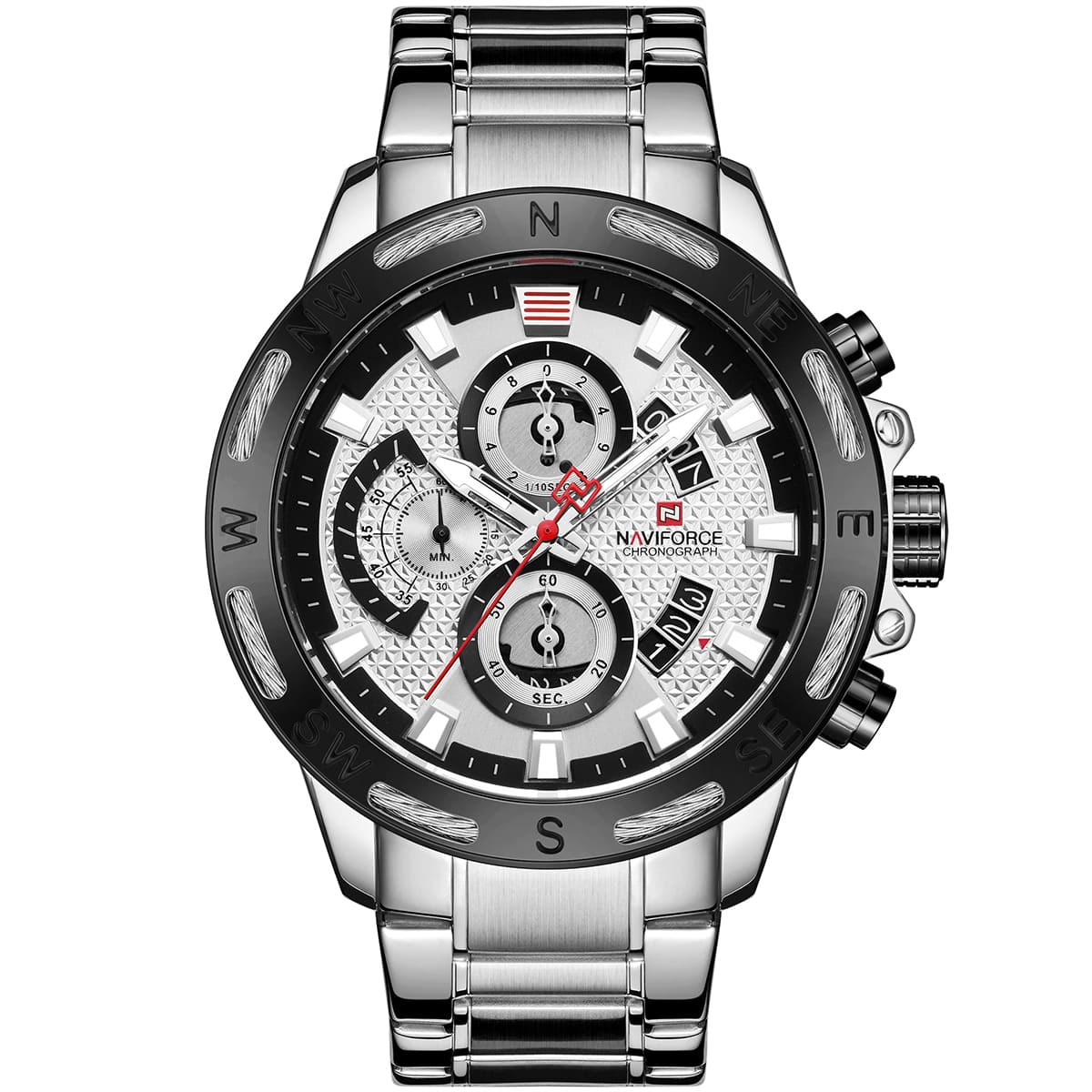 ساعة يد نافي فورس Naviforce NF9165 S W رجالي أصلية موديل ( NF9165 ) نظرية بلون مينا فضي و اسود و استيك معدن بلون فضي احصل عليها غدا خلال 24 ساعة داخل القاهرة و الجيزة و الاسكندرية