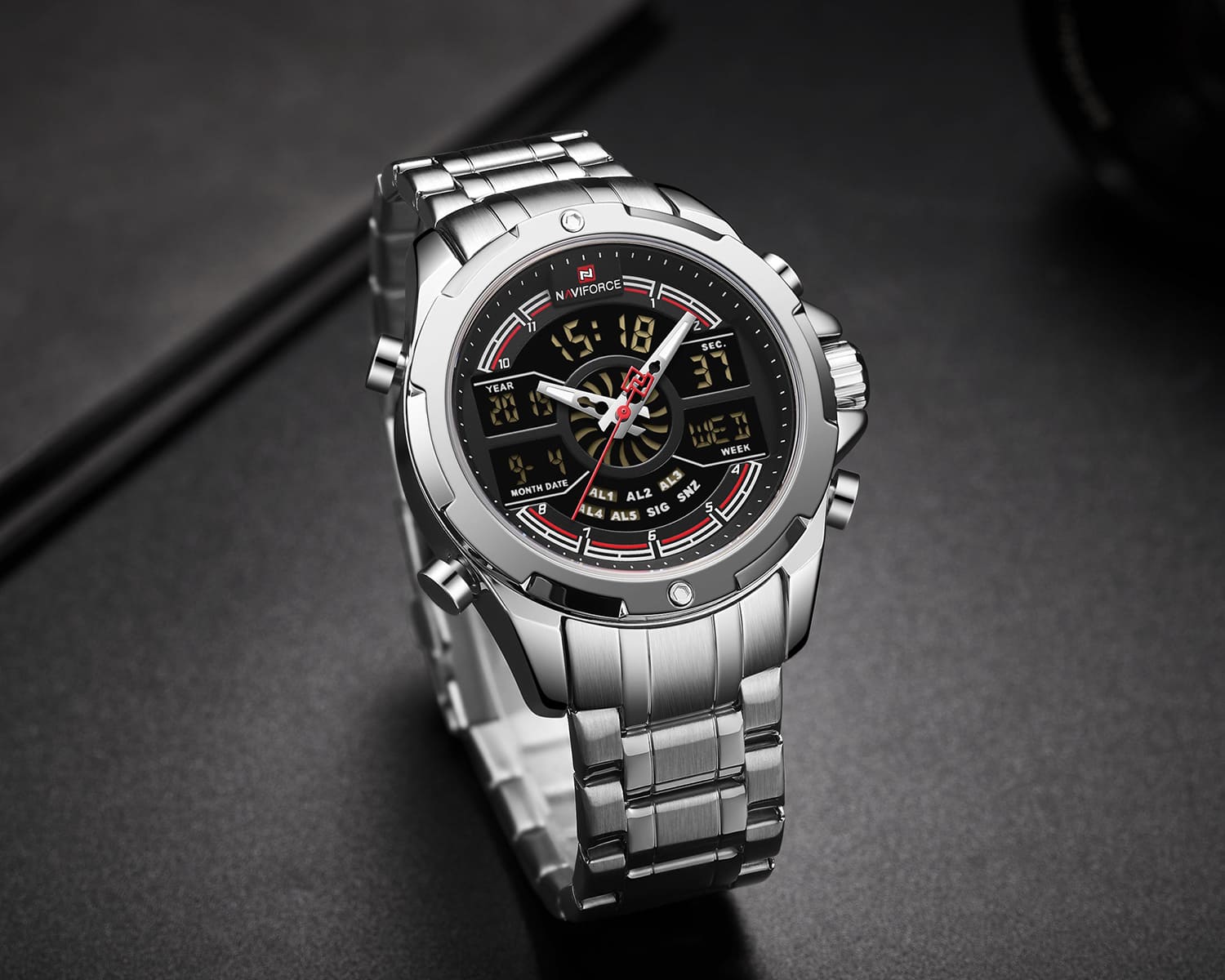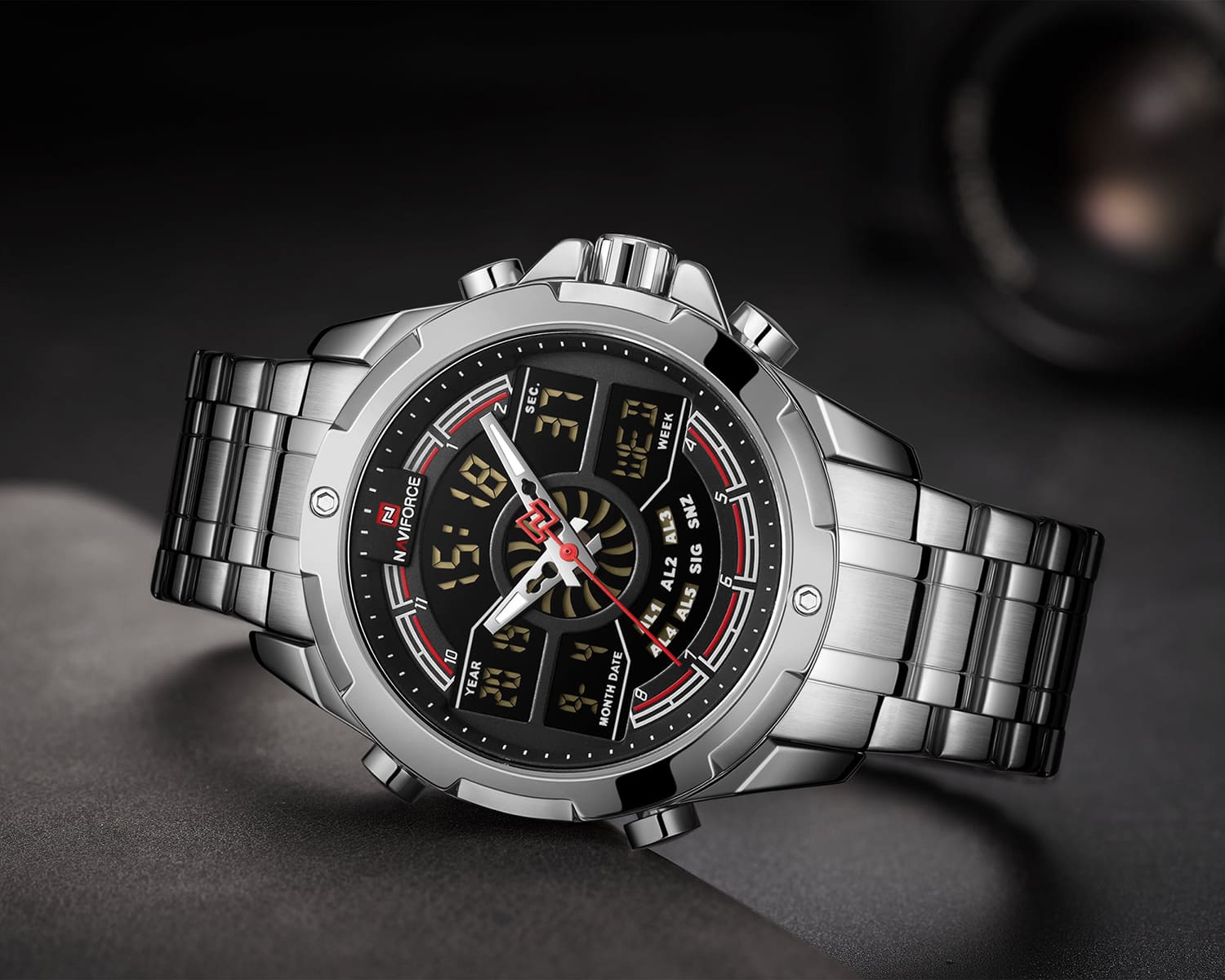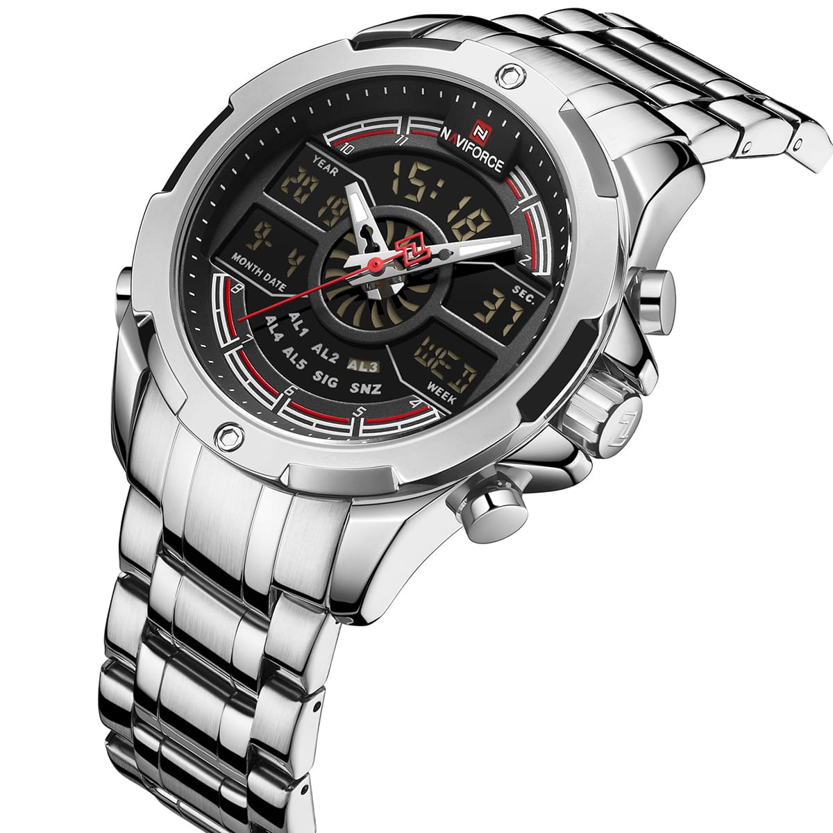 ساعة يد نافي فورس Naviforce NF9170 S B رجالي أصلية موديل ( NF9170 ) نظرية و رقمية بلون مينا اسود و استيك معدن بلون فضي احصل عليها غدا خلال 24 ساعة داخل القاهرة و الجيزة و الاسكندرية
