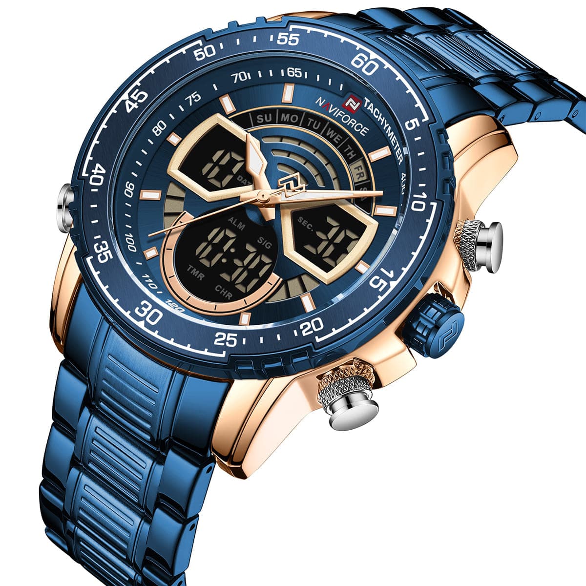 ساعة يد نافي فورس Naviforce NF9189 RG BE رجالي أصلية موديل ( NF9189 ) نظرية و رقمية بلون مينا ازرق و استيك معدن بلون ازرق احصل عليها غدا خلال 24 ساعة داخل القاهرة و الجيزة و الاسكندرية