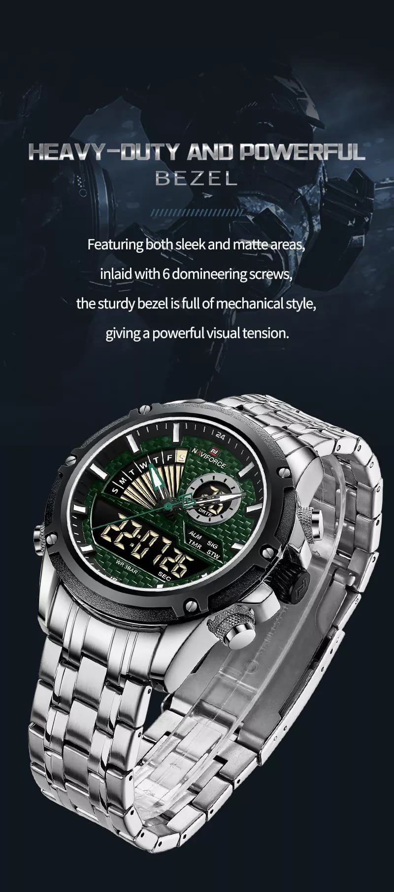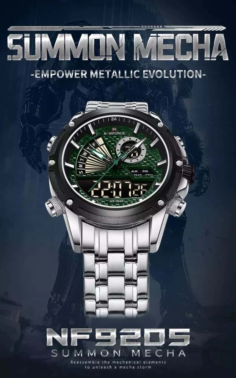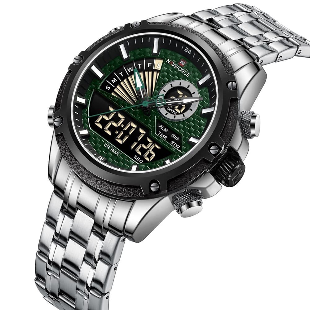 ساعة يد نافي فورس Naviforce NF9205 S GN رجالي أصلية موديل ( NF9205 ) نظرية و رقمية بلون مينا اخضر و استيك معدن بلون فضي احصل عليها غدا خلال 24 ساعة داخل القاهرة و الجيزة و الاسكندرية