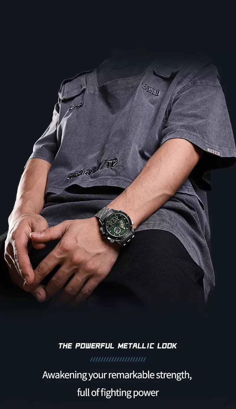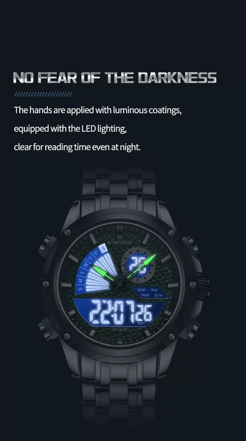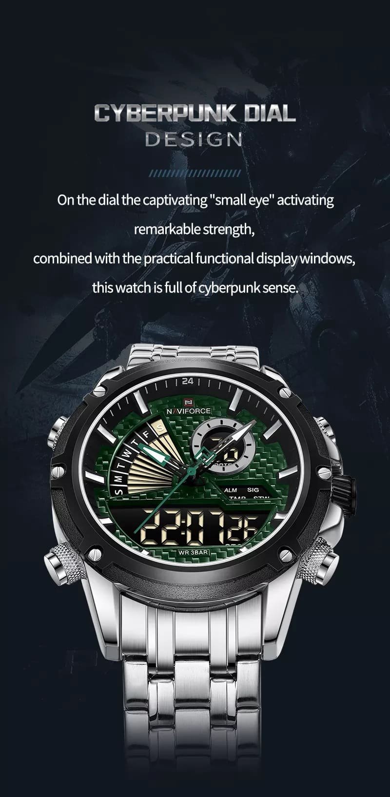 ساعة يد نافي فورس Naviforce NF9205 S GN رجالي أصلية موديل ( NF9205 ) نظرية و رقمية بلون مينا اخضر و استيك معدن بلون فضي احصل عليها غدا خلال 24 ساعة داخل القاهرة و الجيزة و الاسكندرية