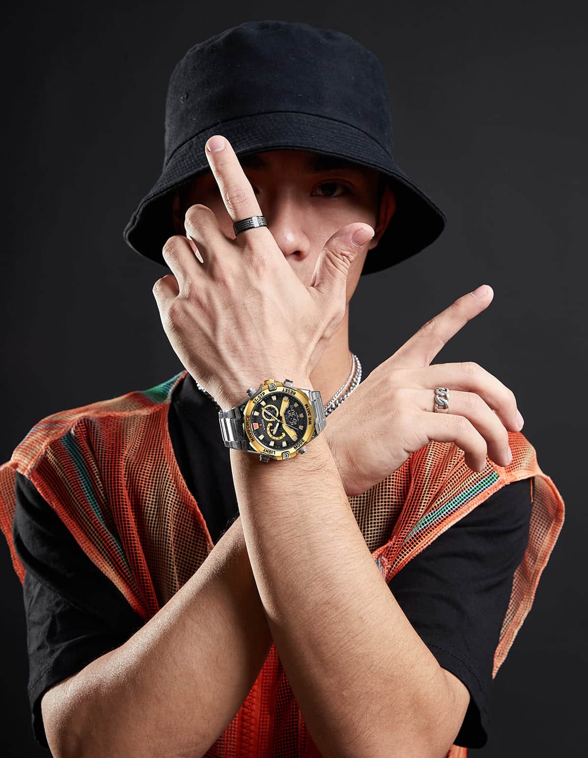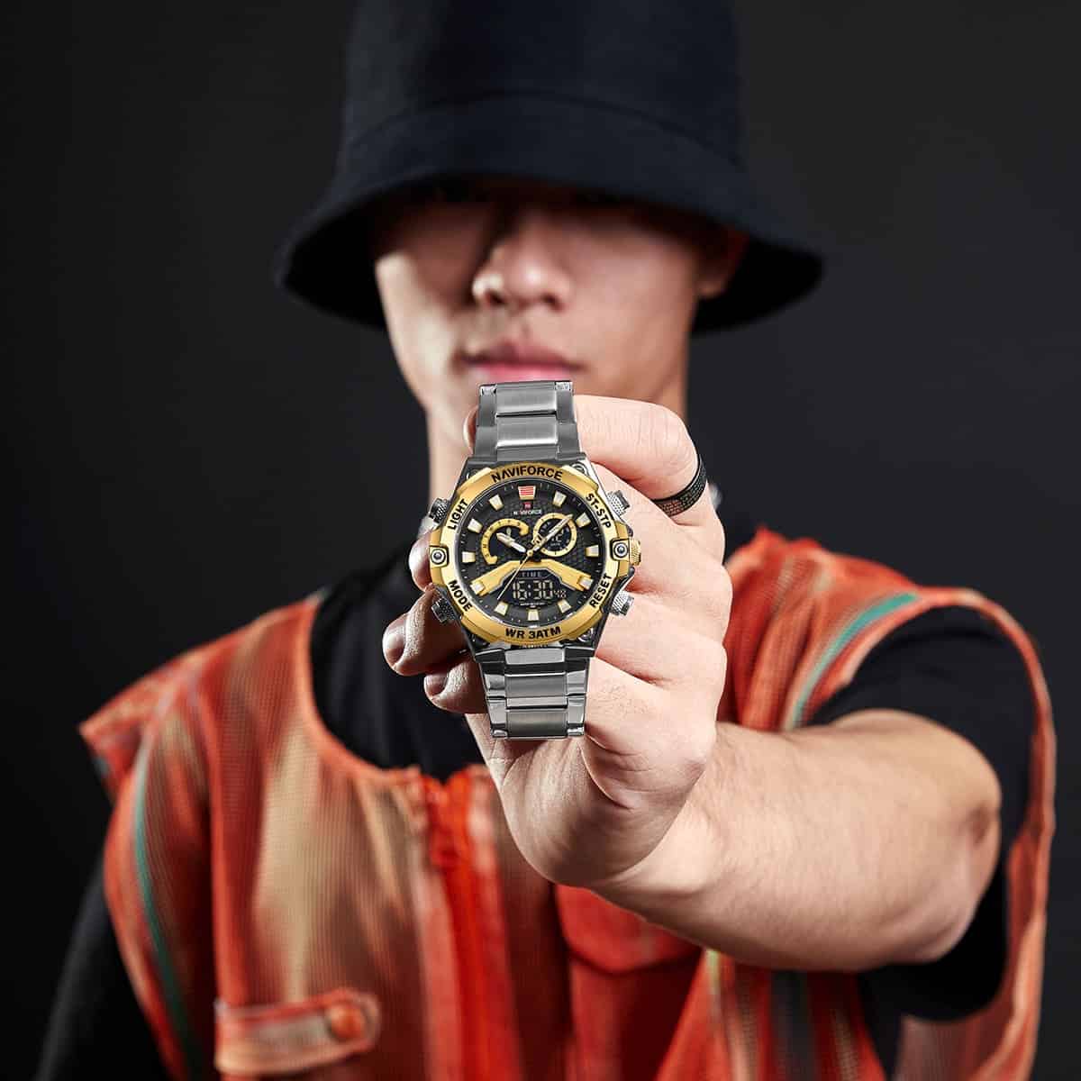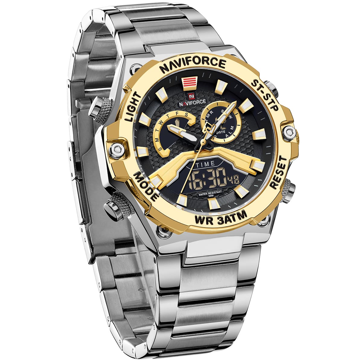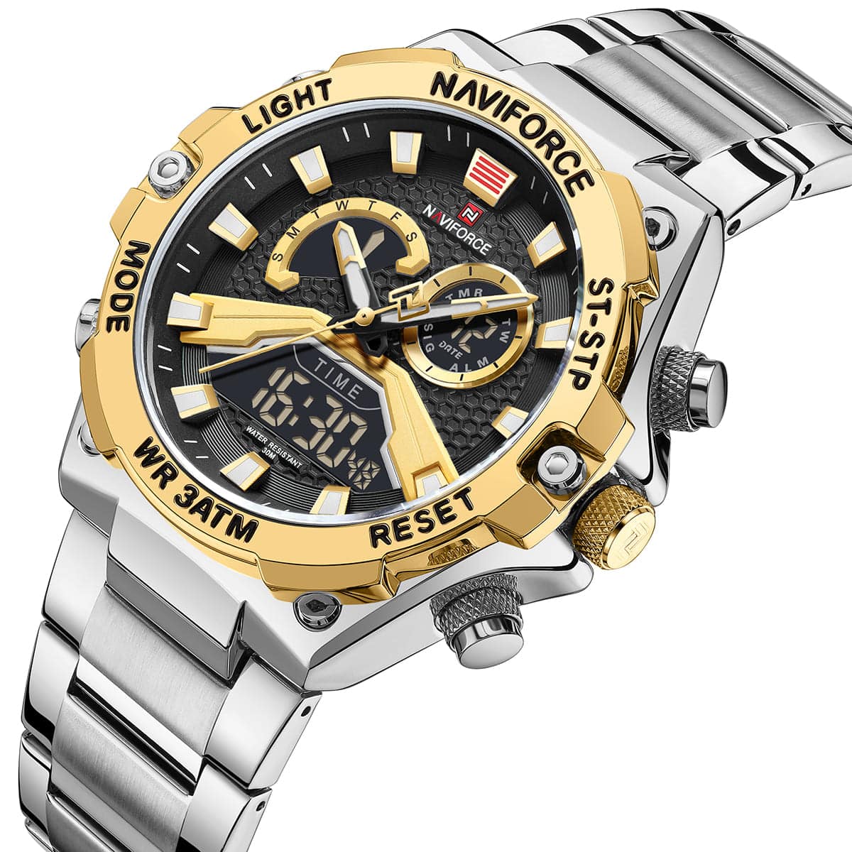 ساعة يد نافي فورس Naviforce NF 9207 S G B رجالي أصلية موديل ( NF9207 ) نظرية و رقميةبلون مينا اسود و ذهبي و استيك معدن بلون فضي احصل عليها غدا خلال 24 ساعة داخل القاهرة و الجيزة و الاسكندرية