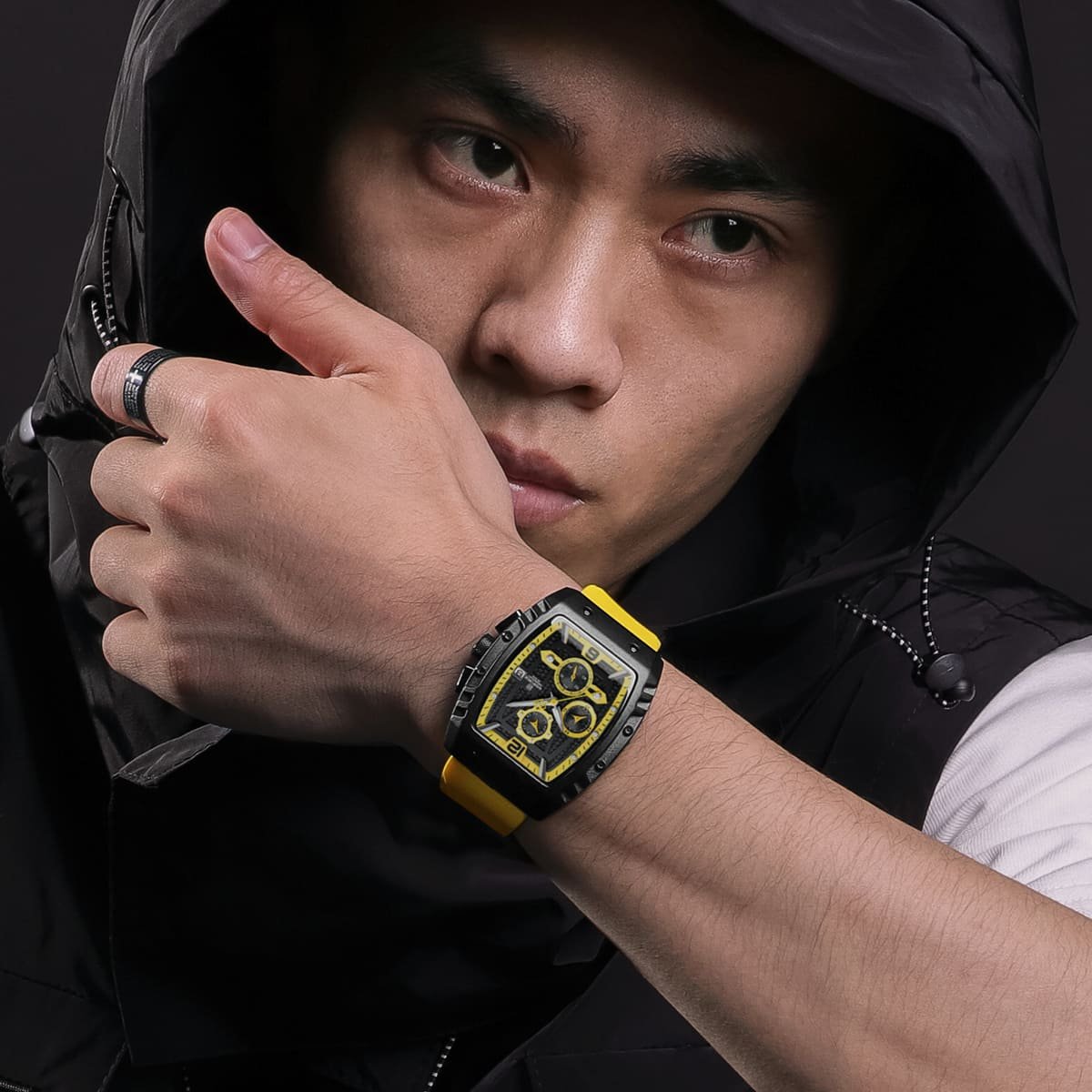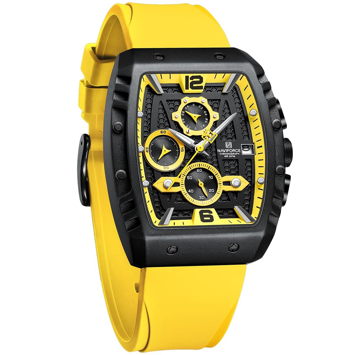 ساعة يد نافي فورس Naviforce NF 8025 B Y Y رجالي أصلية موديل ( NF8025 ) نظرية Chronograph-WR3ATM  بلون اصفر و استيك سيليكون مطاط بلون اصفر احصل عليها الآن من المرشدى للساعات – Elmorshedy Watches
