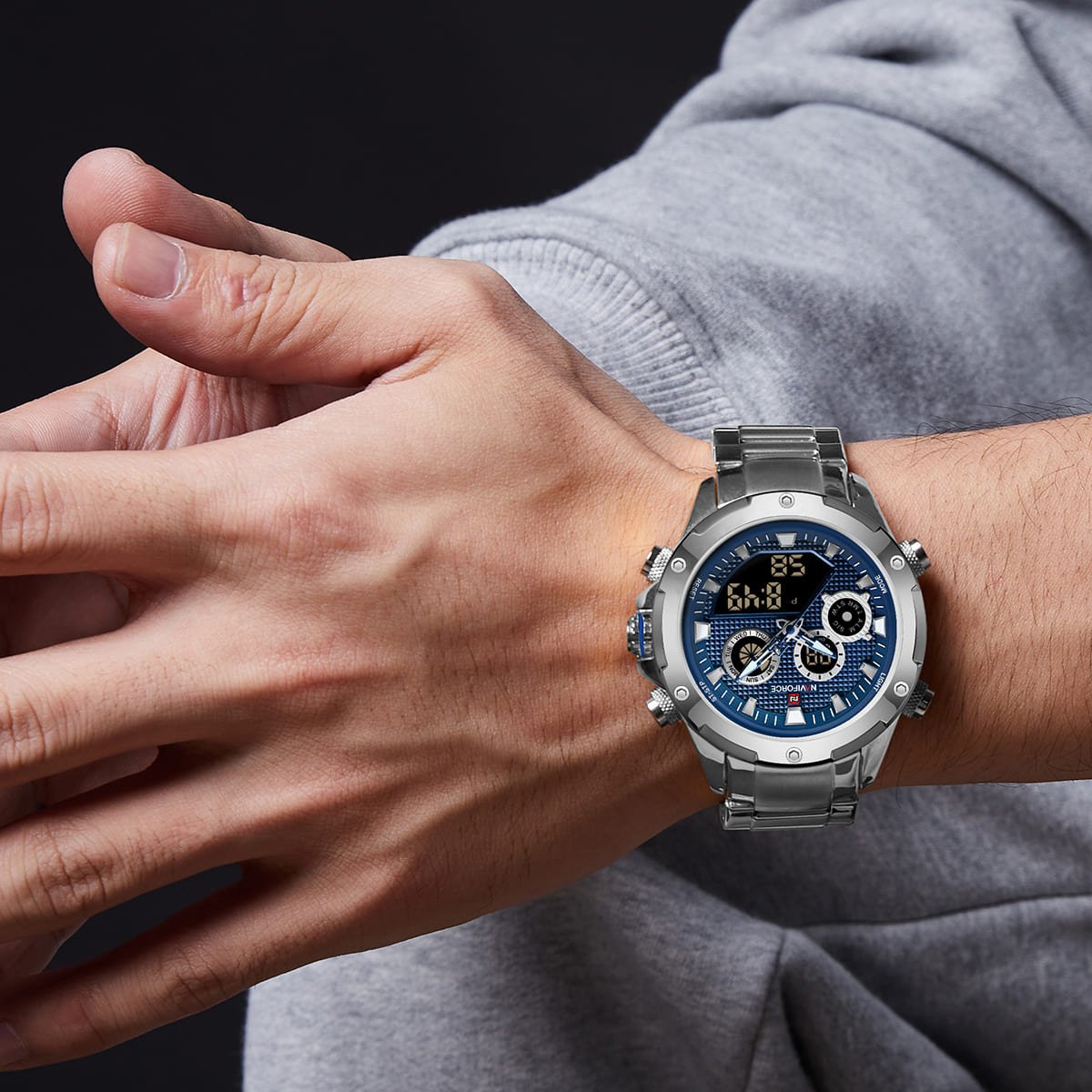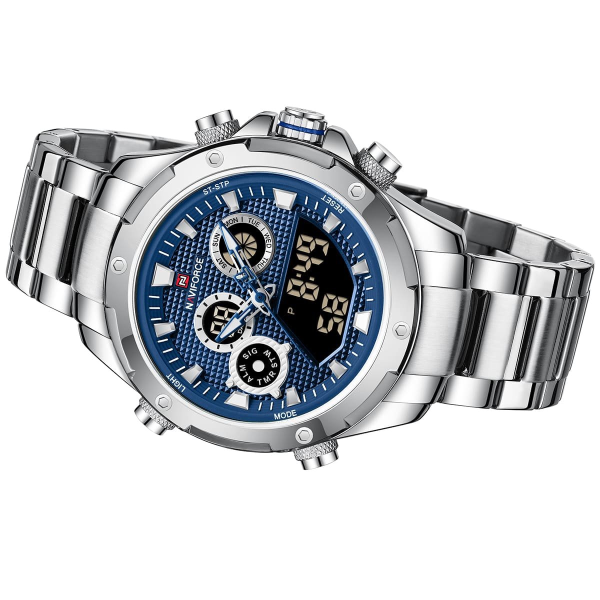 ساعة يد نافي فورس Naviforce NF 9217 S BE رجالي أصلية موديل ( NF9217 ) نظرية و رقمية بلون ازرق و استيك ستانلس ستيل بلون فضي  احصل عليها الآن من المرشدى للساعات – Elmorshedy Watches