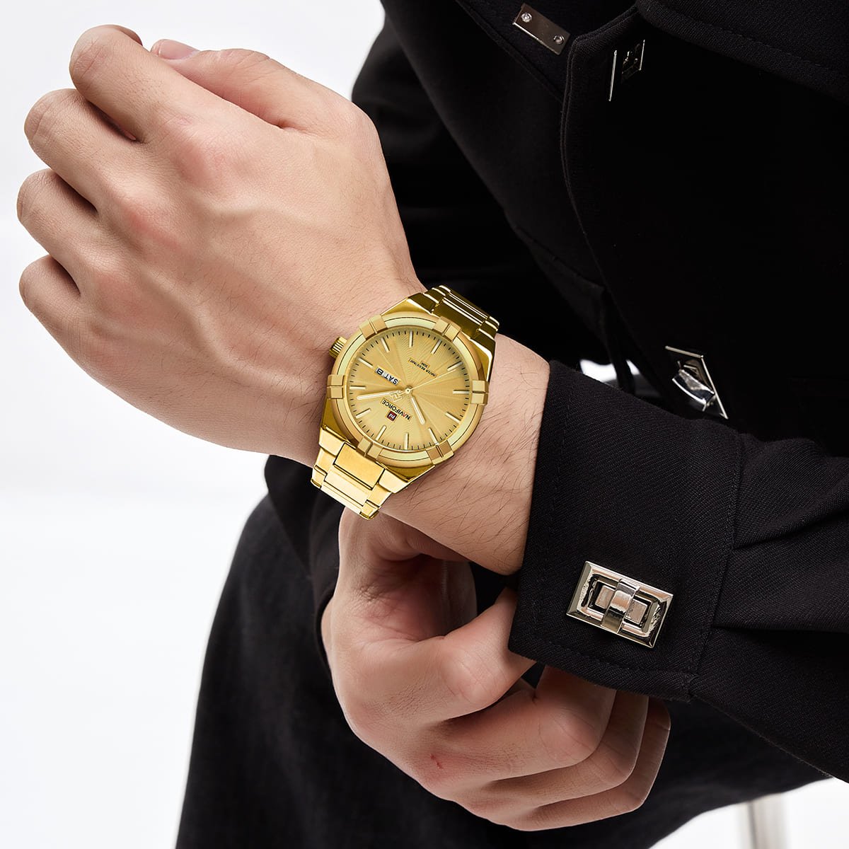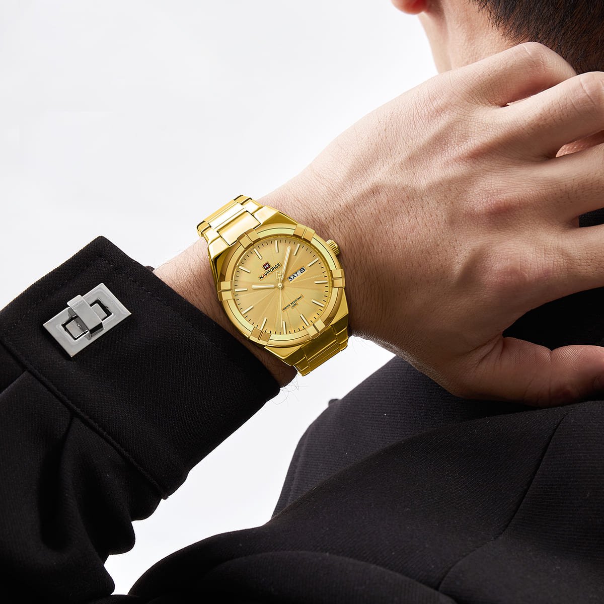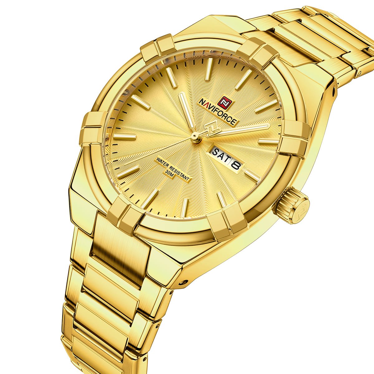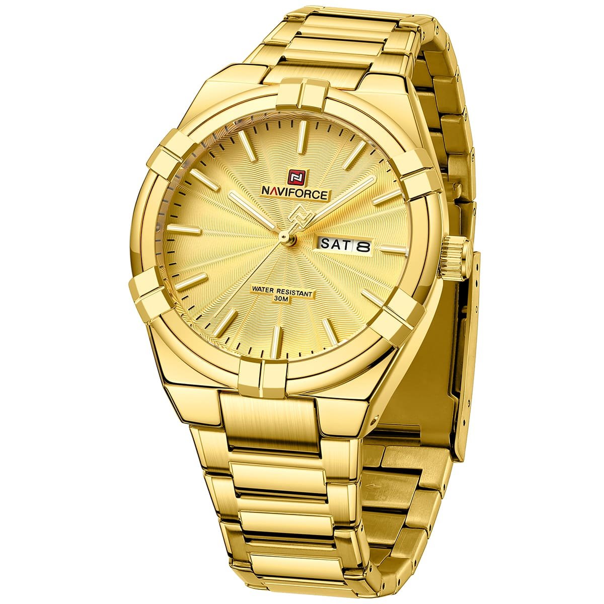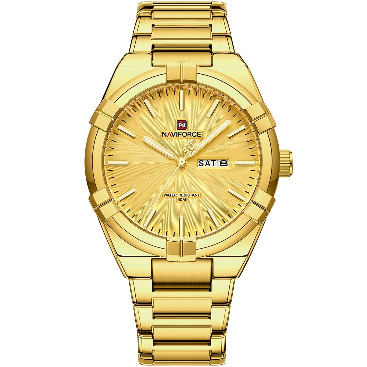 ساعة يد نافي فورس Naviforce NF 9218 G G رجالي أصلية موديل ( NF9218 ) نظرية Water Resistant-30M بلون ذهبي و استيك ستانلس ستيل بلون ذهبي احصل عليها الآن من المرشدى للساعات – Elmorshedy Watches
