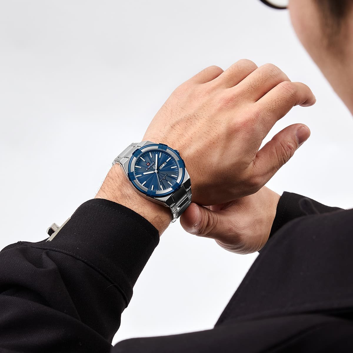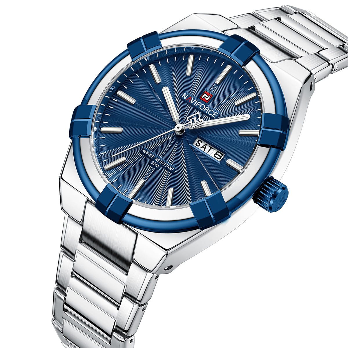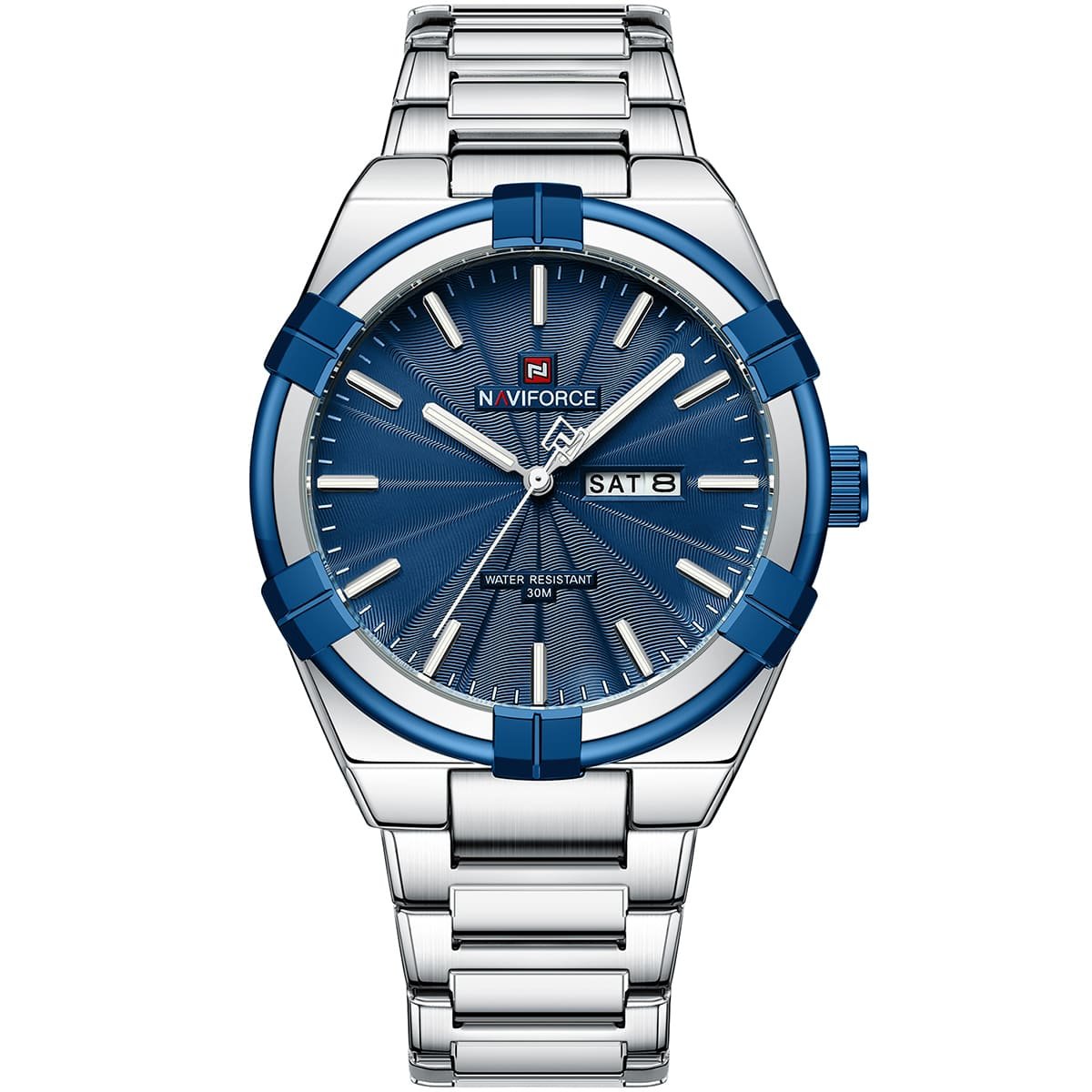 ساعة يد نافي فورس Naviforce NF 9218 S BE رجالي أصلية موديل ( NF9218 ) نظرية Water Resistant-30M بلون ازرق و استيك ستانلس ستيل بلون فضي  احصل عليها الآن من المرشدى للساعات – Elmorshedy Watches