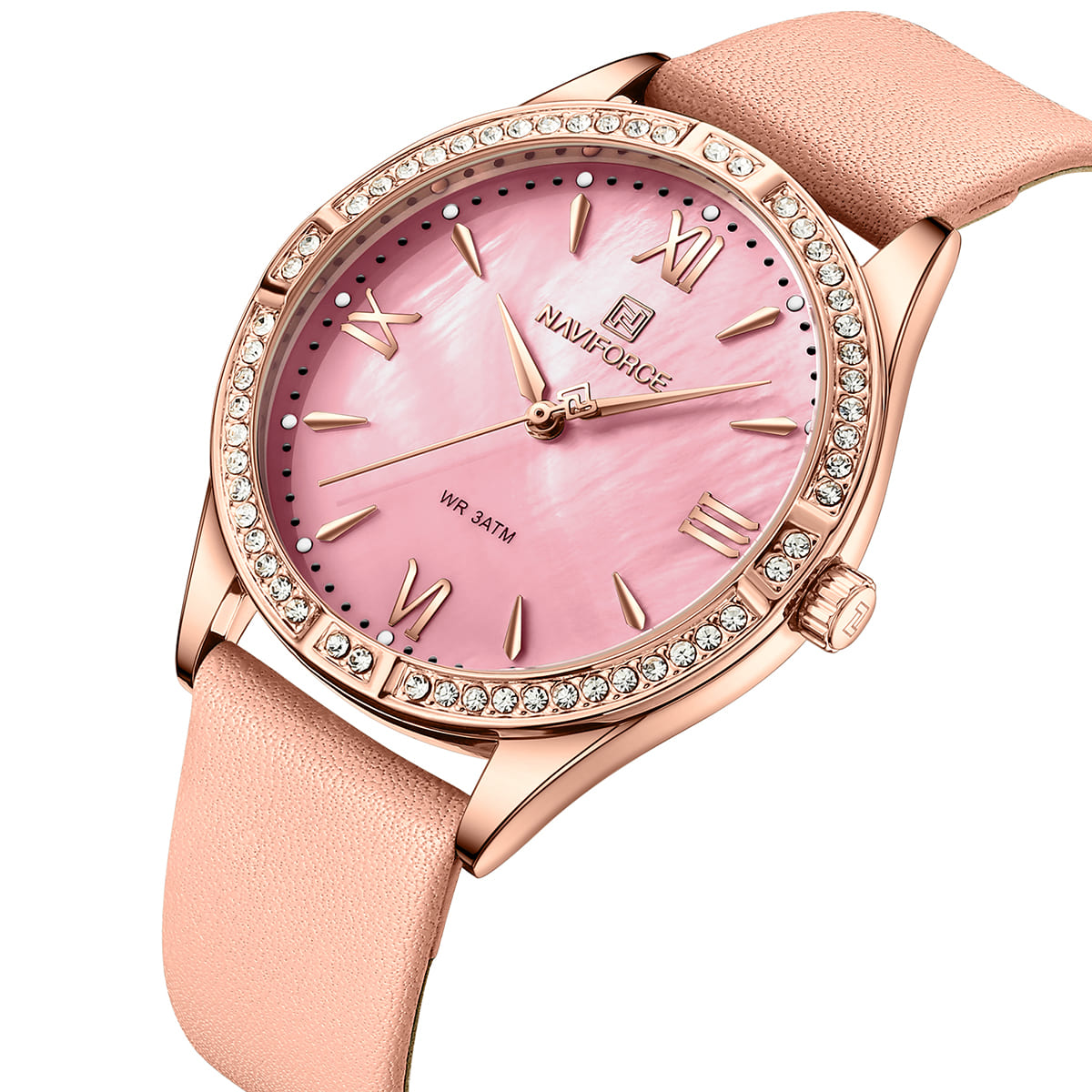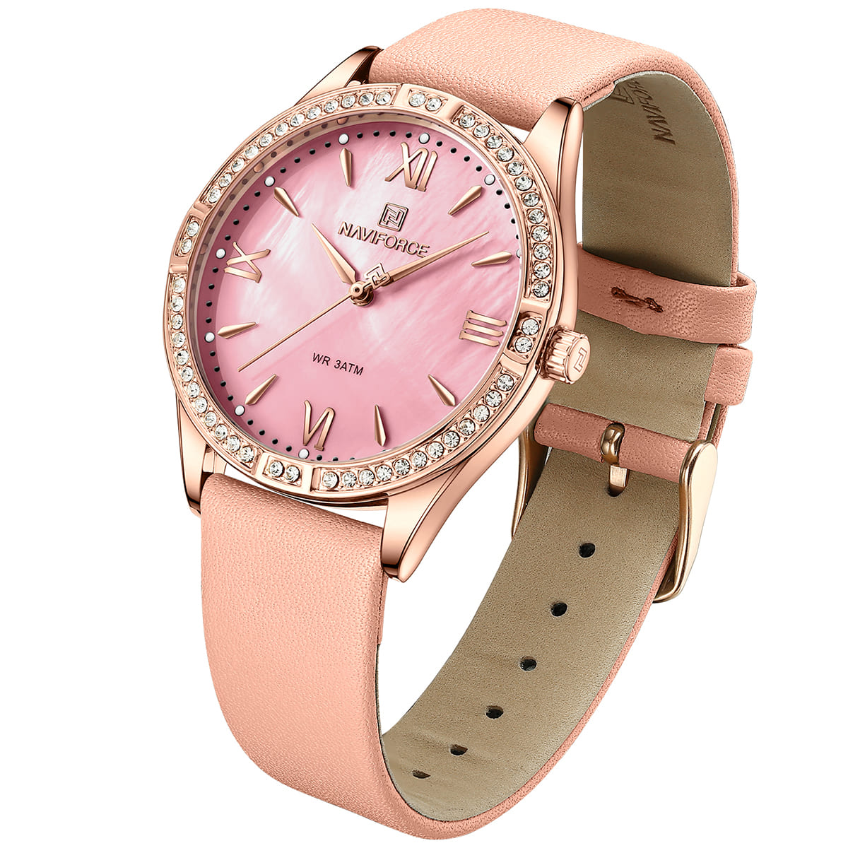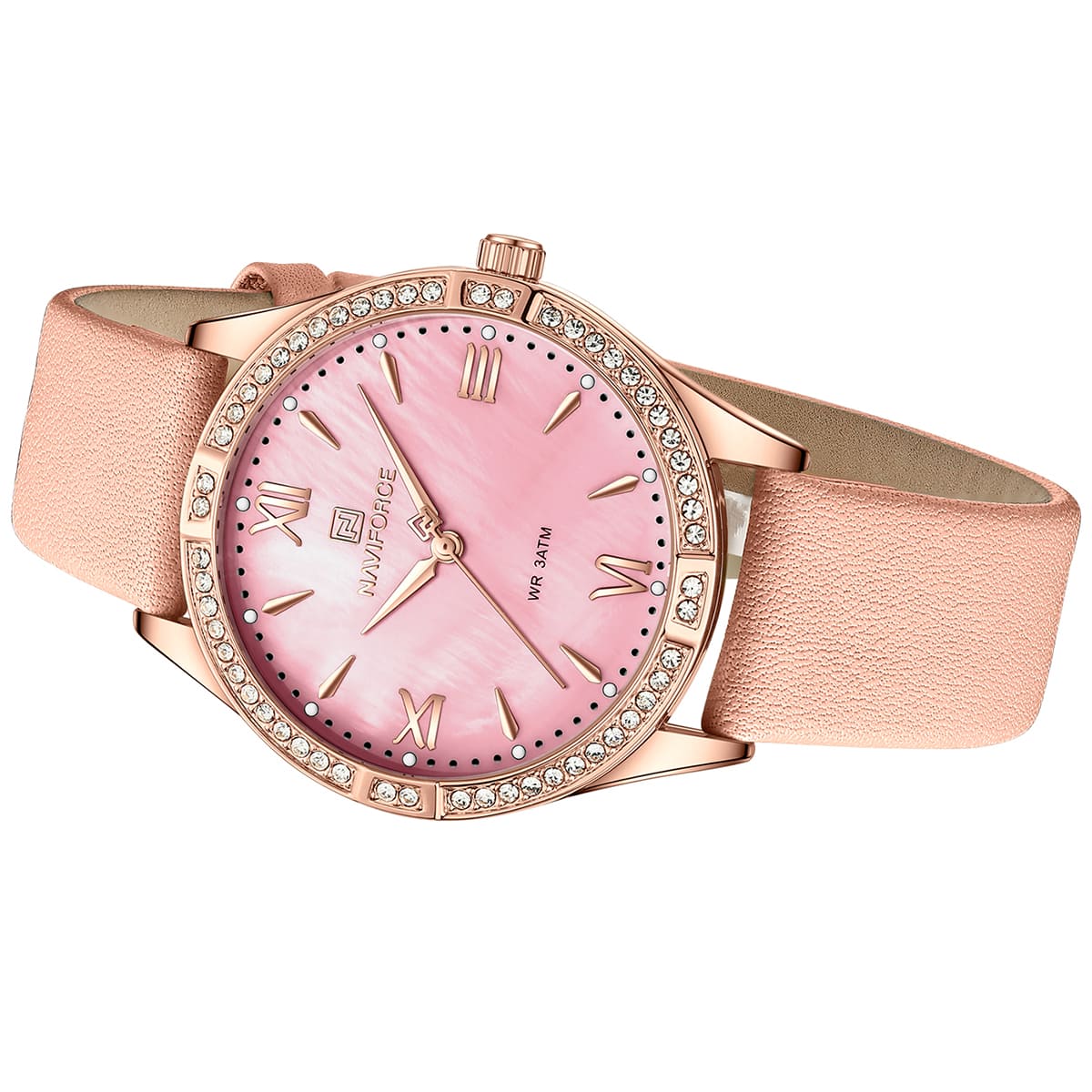 ساعة يد نافي فورس Naviforce NF 5038 RG R حريمي أصلية موديل ( NF5038 ) نظرية WR 3ATM  بلون وردي و استيك جلد بلون ورديالساعة مزينة بمينا بألوان متداخلة بشكل رخامي لؤلؤي متجعد احصل عليها الآن من المرشدى للساعات – Elmorshedy Watches
