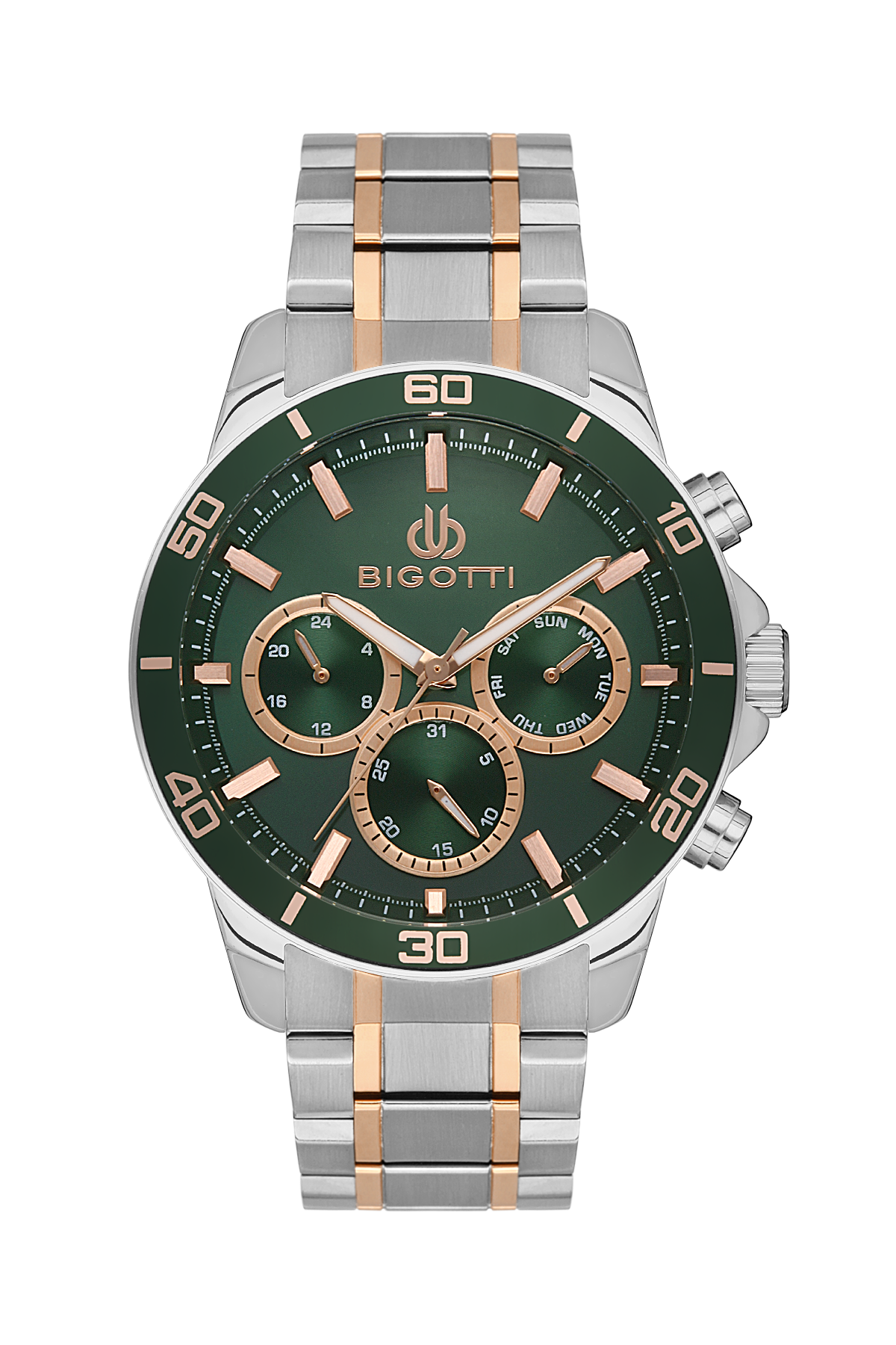 Upgrade your accessory collection with this analog watch from the house of Bigotti Milano. The green dial and silver and gold Metal Band of this watch for Men offer high quality as well as lightweight feel. Designed to perfection, this watch will go well with formals and casuals too.